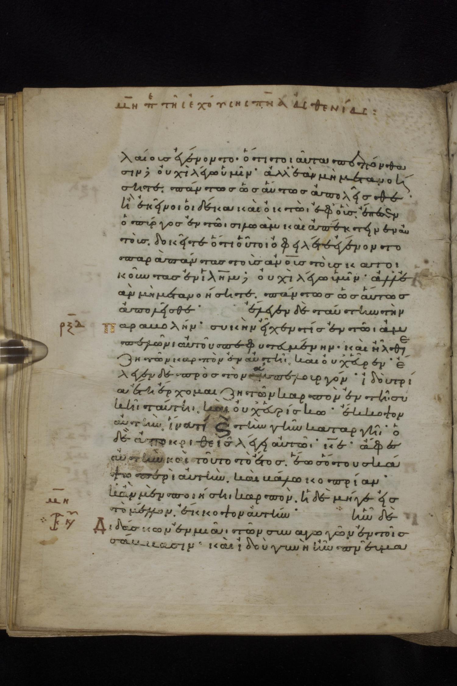 Eleventh century minuscule of the Gospels on parchment; 231 leaves, 1 column, 24 lines per column. Images were taken at the National Library of Greece in Athens.