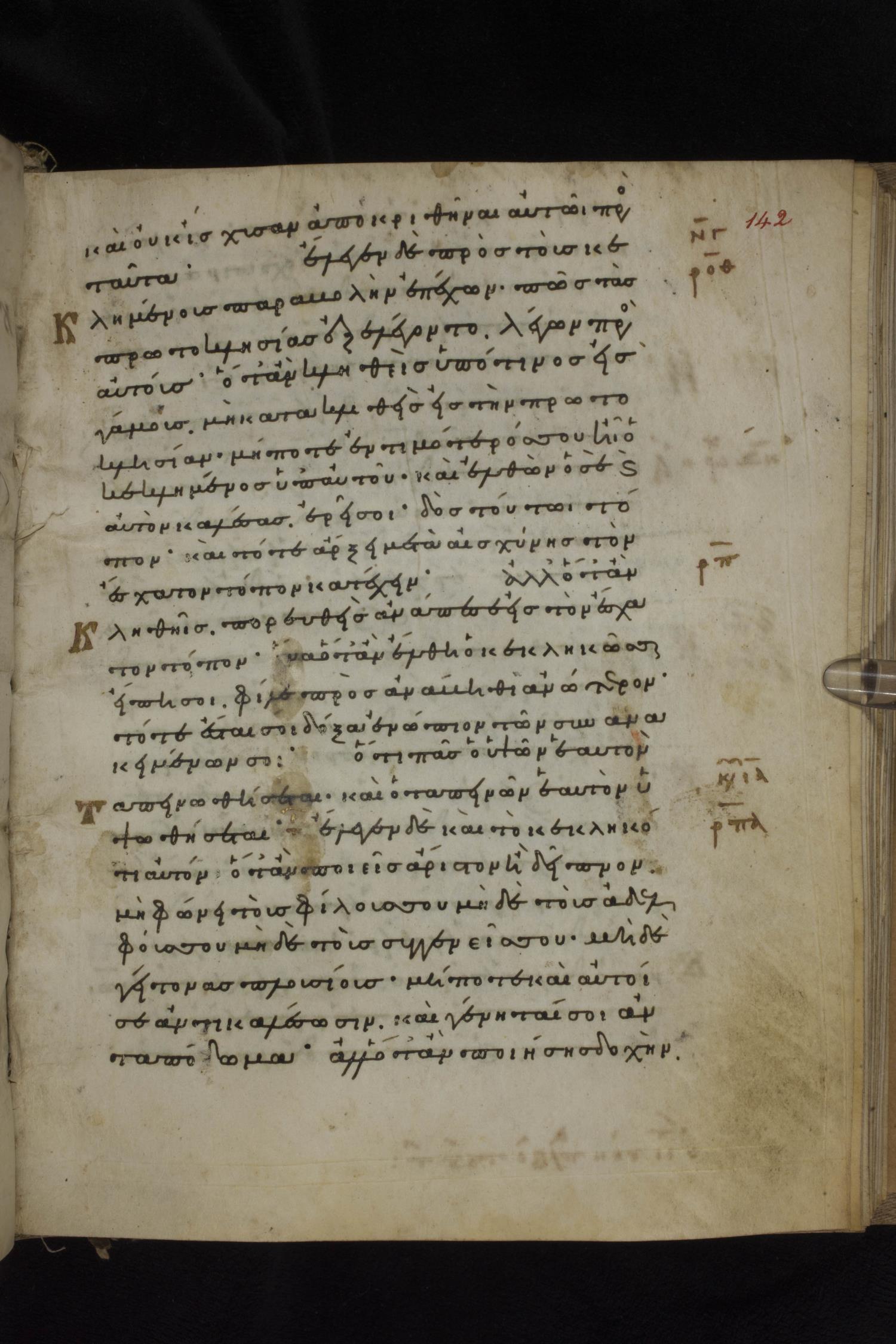 Eleventh century minuscule of the Gospels on parchment; 231 leaves, 1 column, 24 lines per column. Images were taken at the National Library of Greece in Athens.