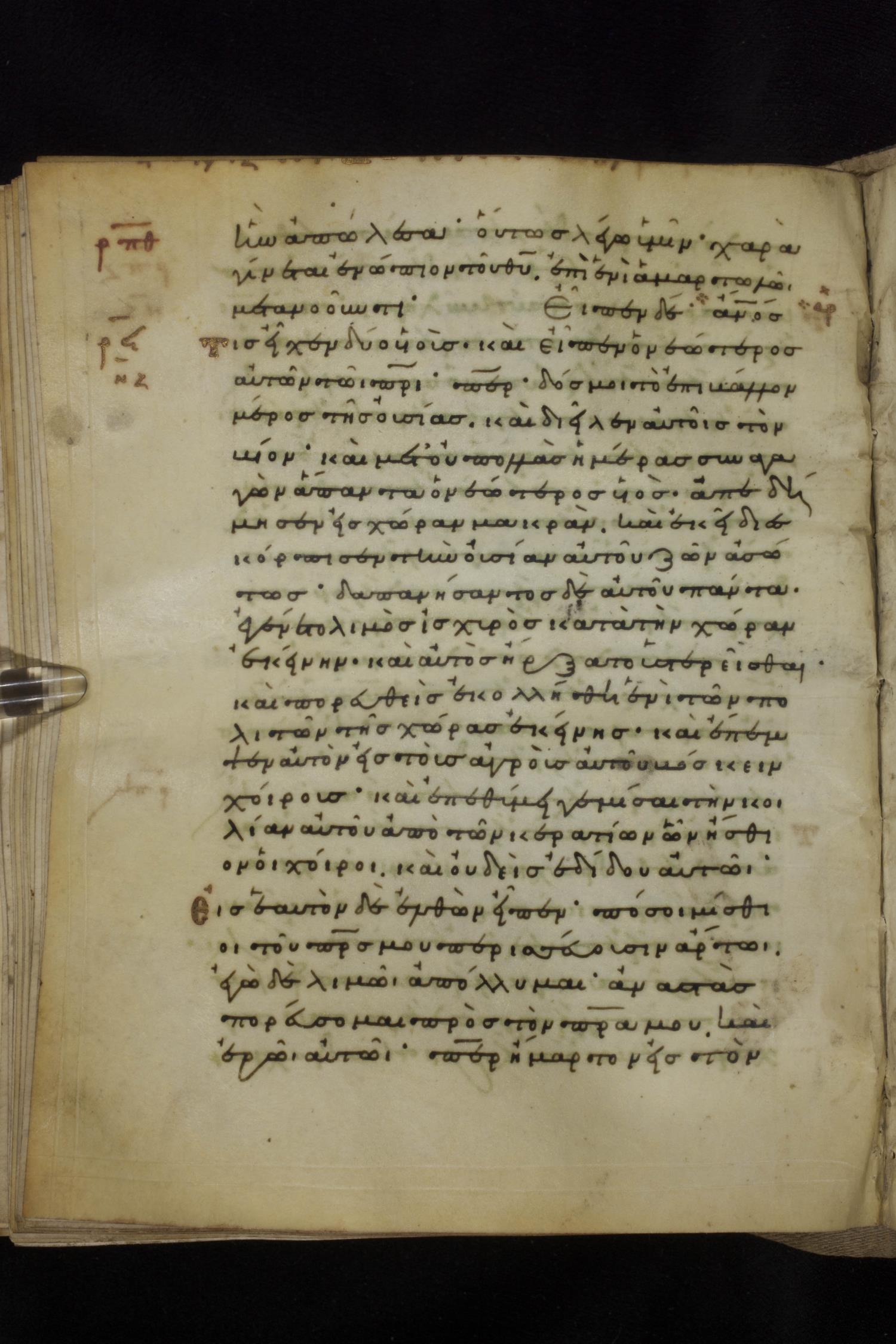 Eleventh century minuscule of the Gospels on parchment; 231 leaves, 1 column, 24 lines per column. Images were taken at the National Library of Greece in Athens.
