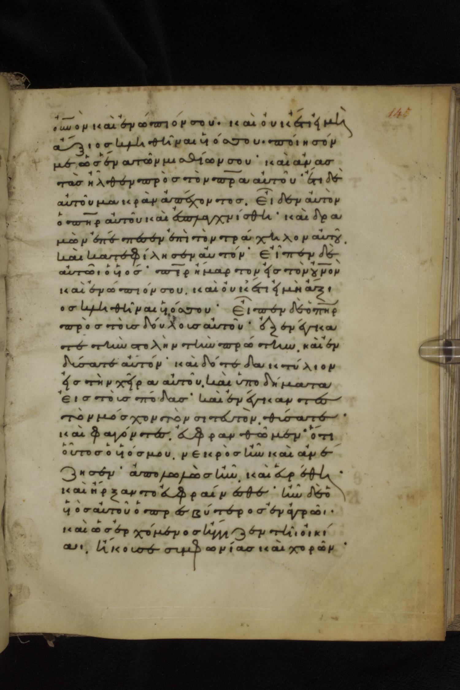 Eleventh century minuscule of the Gospels on parchment; 231 leaves, 1 column, 24 lines per column. Images were taken at the National Library of Greece in Athens.