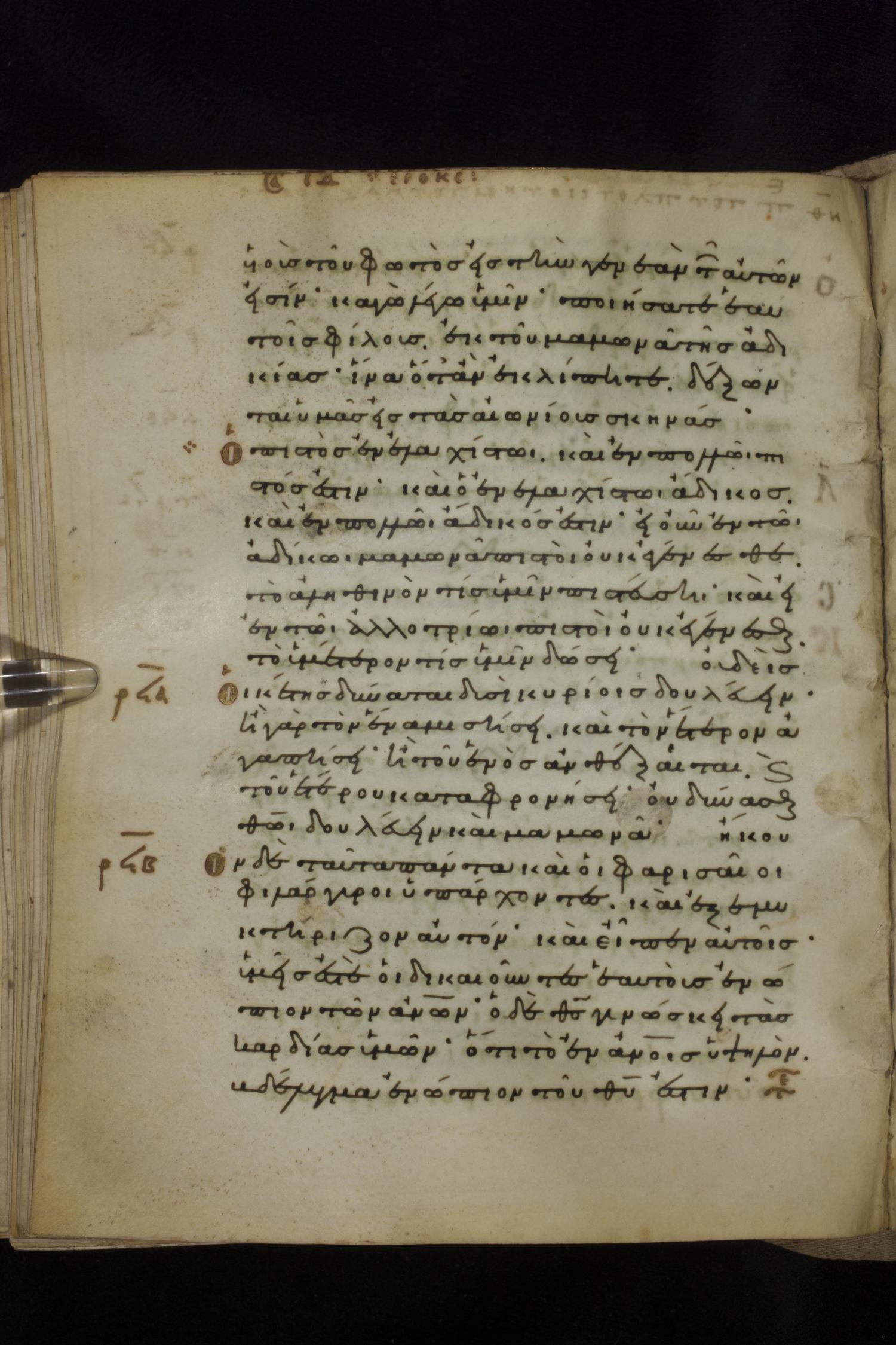 Eleventh century minuscule of the Gospels on parchment; 231 leaves, 1 column, 24 lines per column. Images were taken at the National Library of Greece in Athens.