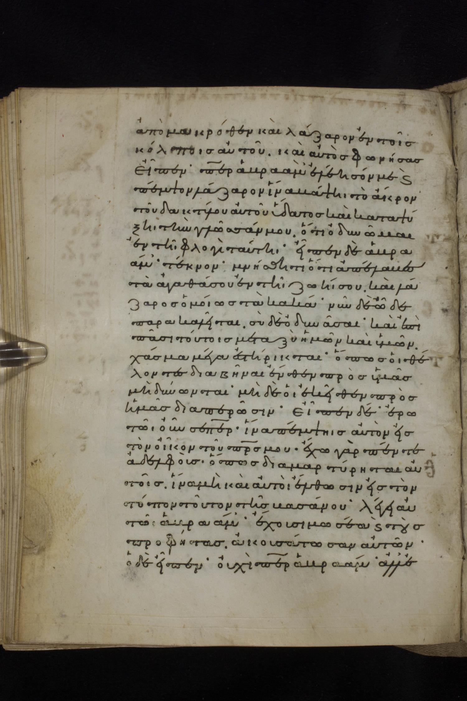 Eleventh century minuscule of the Gospels on parchment; 231 leaves, 1 column, 24 lines per column. Images were taken at the National Library of Greece in Athens.