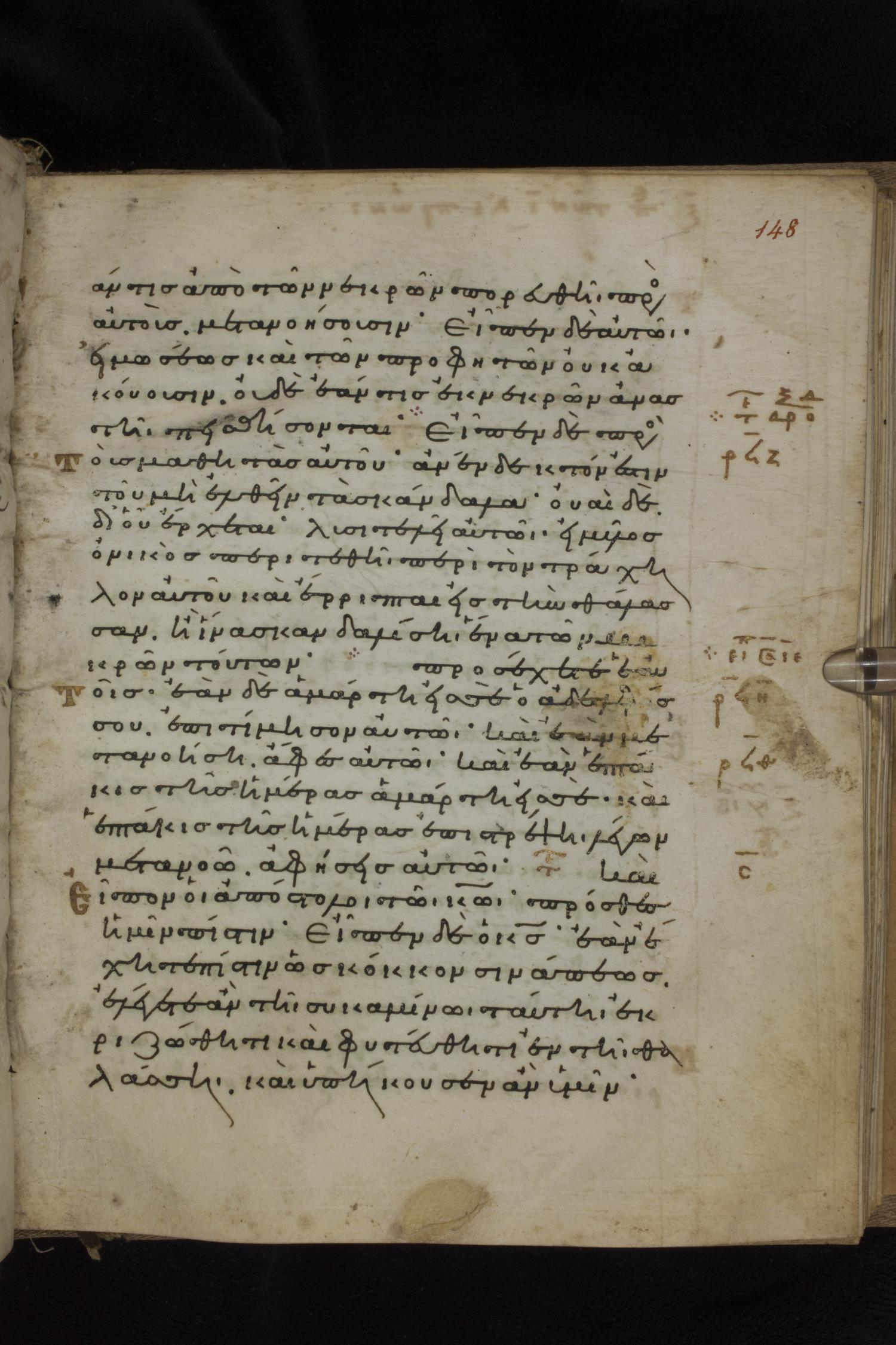 Eleventh century minuscule of the Gospels on parchment; 231 leaves, 1 column, 24 lines per column. Images were taken at the National Library of Greece in Athens.