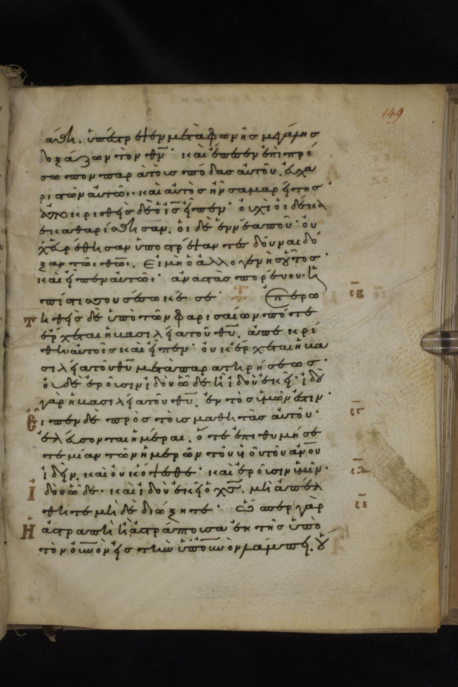 Eleventh century minuscule of the Gospels on parchment; 231 leaves, 1 column, 24 lines per column. Images were taken at the National Library of Greece in Athens.