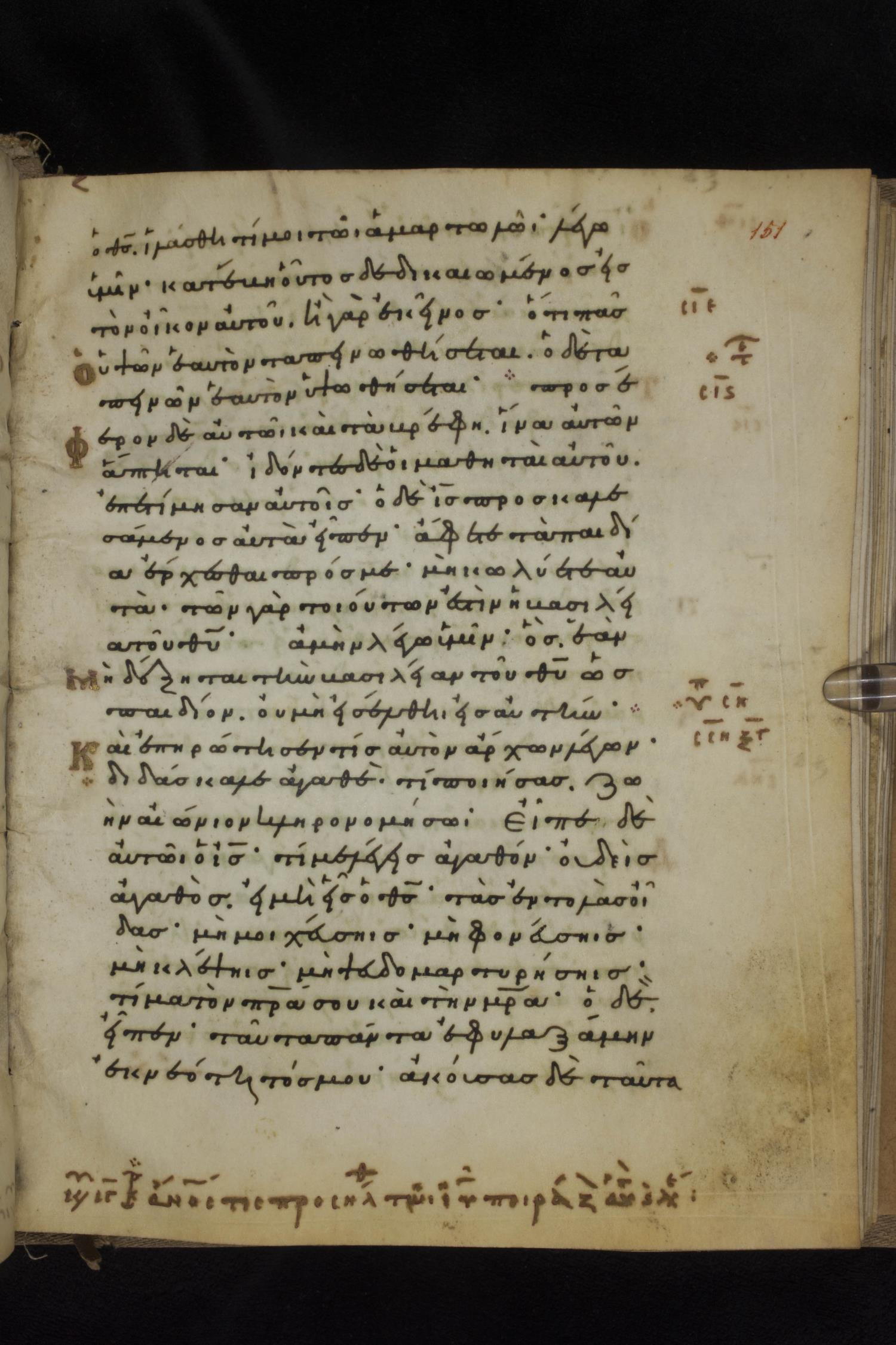 Eleventh century minuscule of the Gospels on parchment; 231 leaves, 1 column, 24 lines per column. Images were taken at the National Library of Greece in Athens.