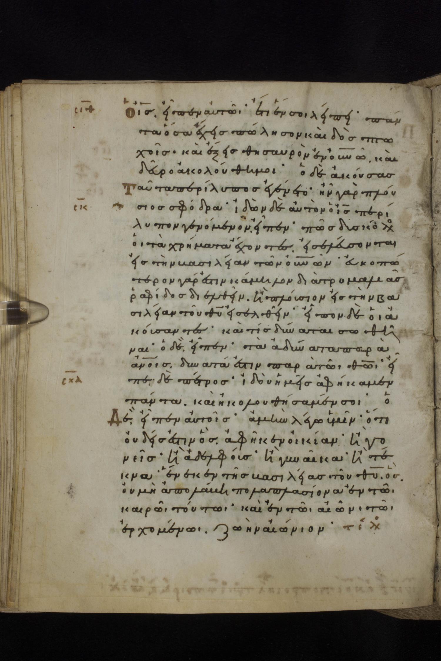 Eleventh century minuscule of the Gospels on parchment; 231 leaves, 1 column, 24 lines per column. Images were taken at the National Library of Greece in Athens.