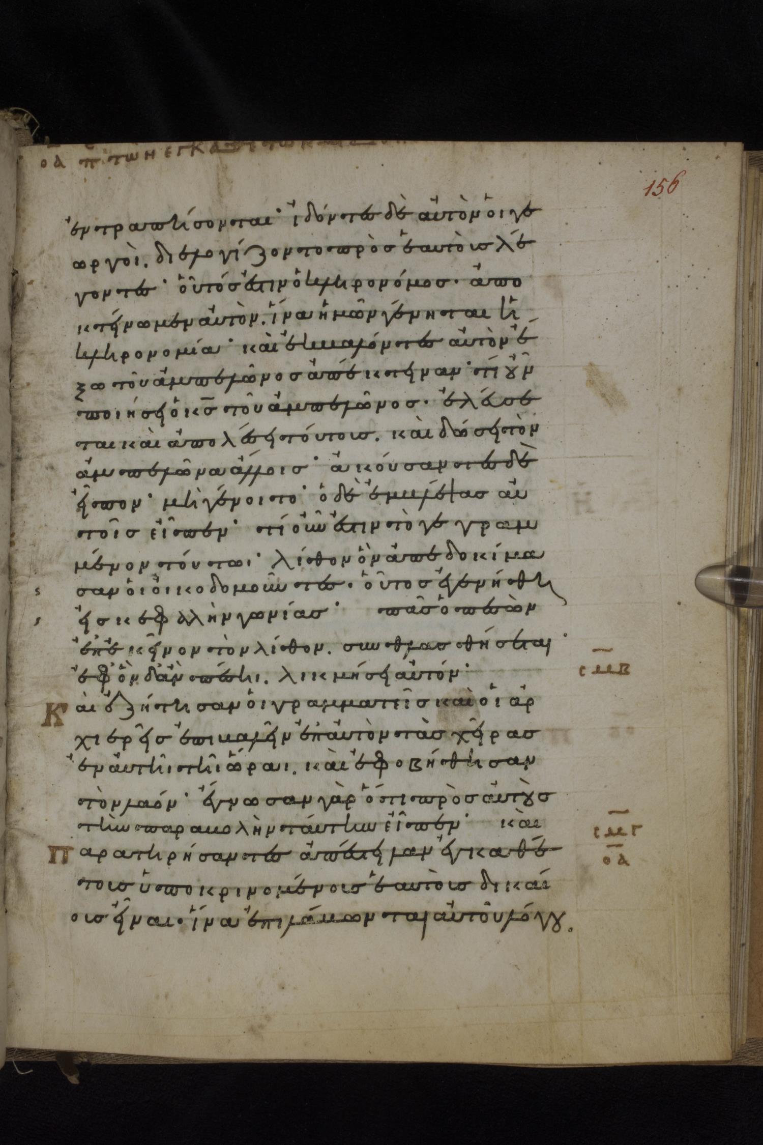 Eleventh century minuscule of the Gospels on parchment; 231 leaves, 1 column, 24 lines per column. Images were taken at the National Library of Greece in Athens.