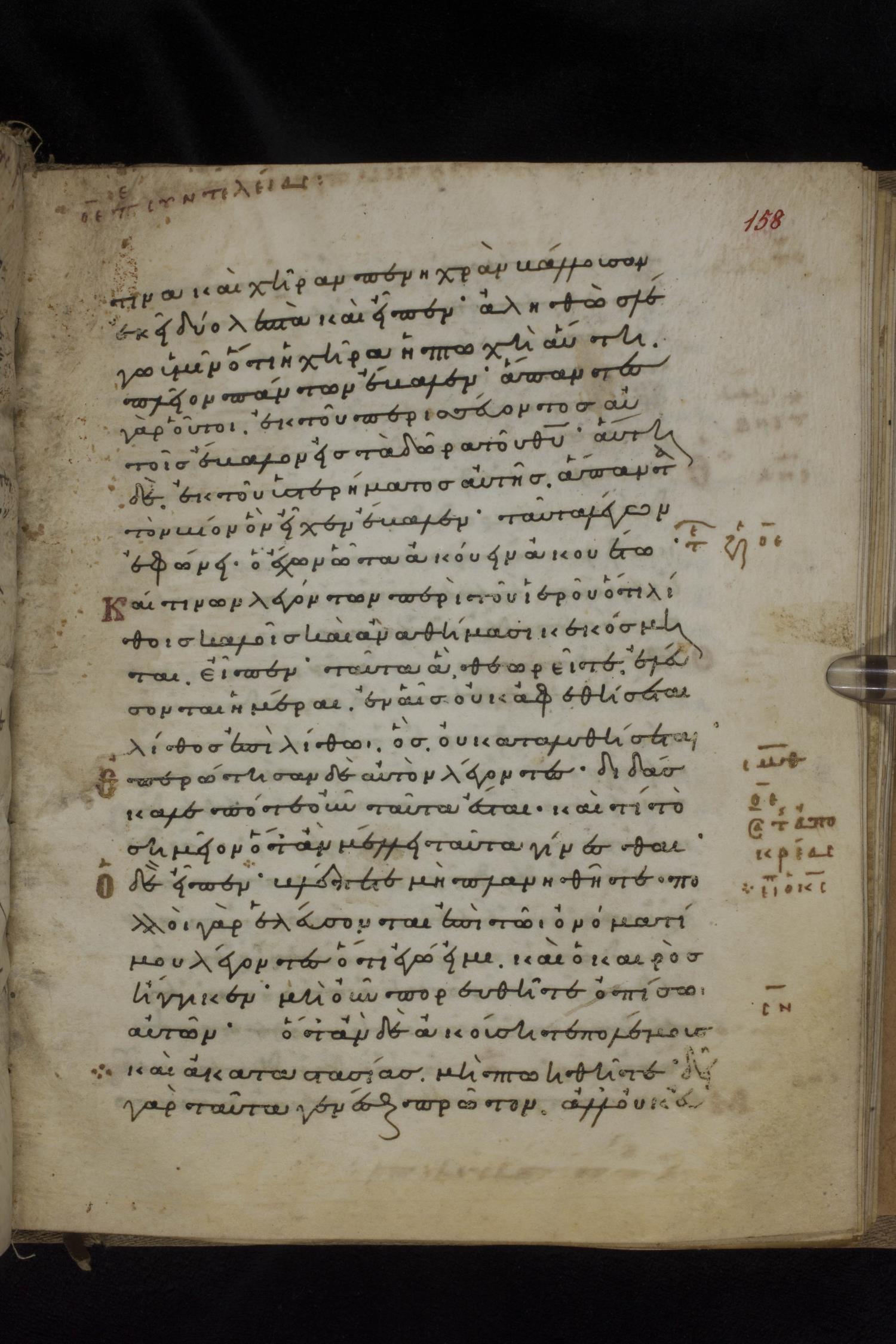 Eleventh century minuscule of the Gospels on parchment; 231 leaves, 1 column, 24 lines per column. Images were taken at the National Library of Greece in Athens.