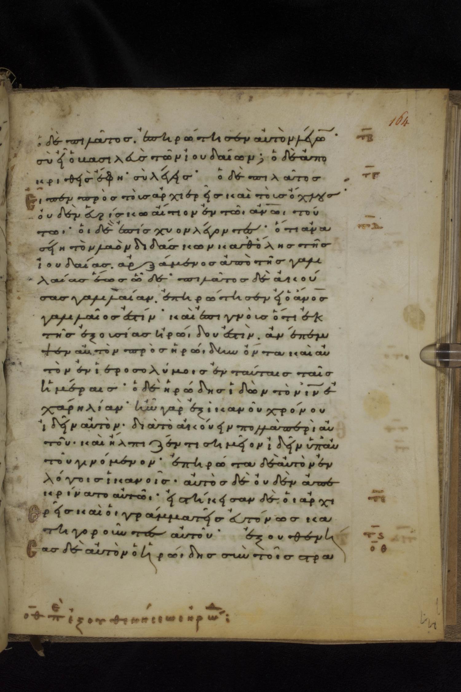 Eleventh century minuscule of the Gospels on parchment; 231 leaves, 1 column, 24 lines per column. Images were taken at the National Library of Greece in Athens.