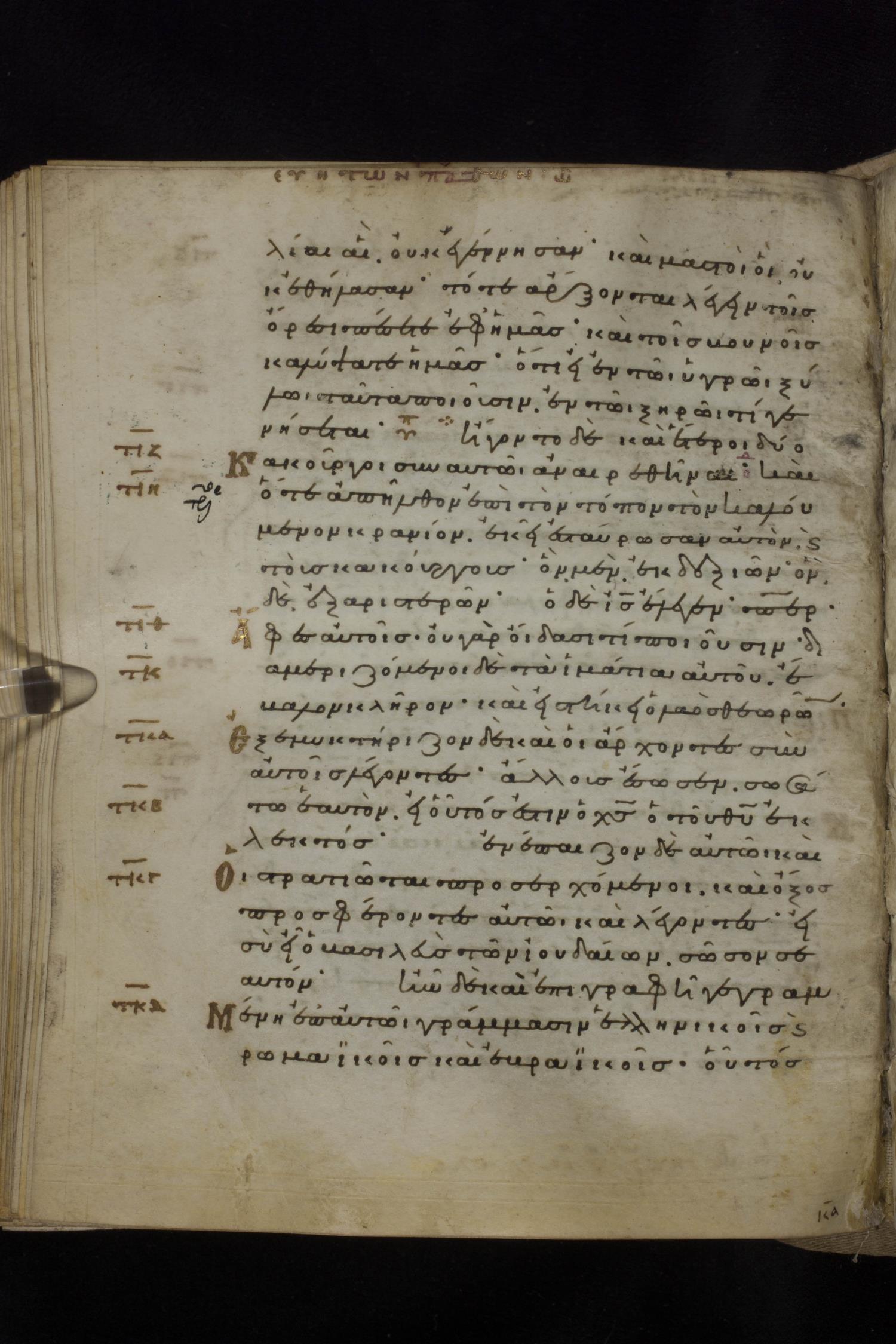 Eleventh century minuscule of the Gospels on parchment; 231 leaves, 1 column, 24 lines per column. Images were taken at the National Library of Greece in Athens.