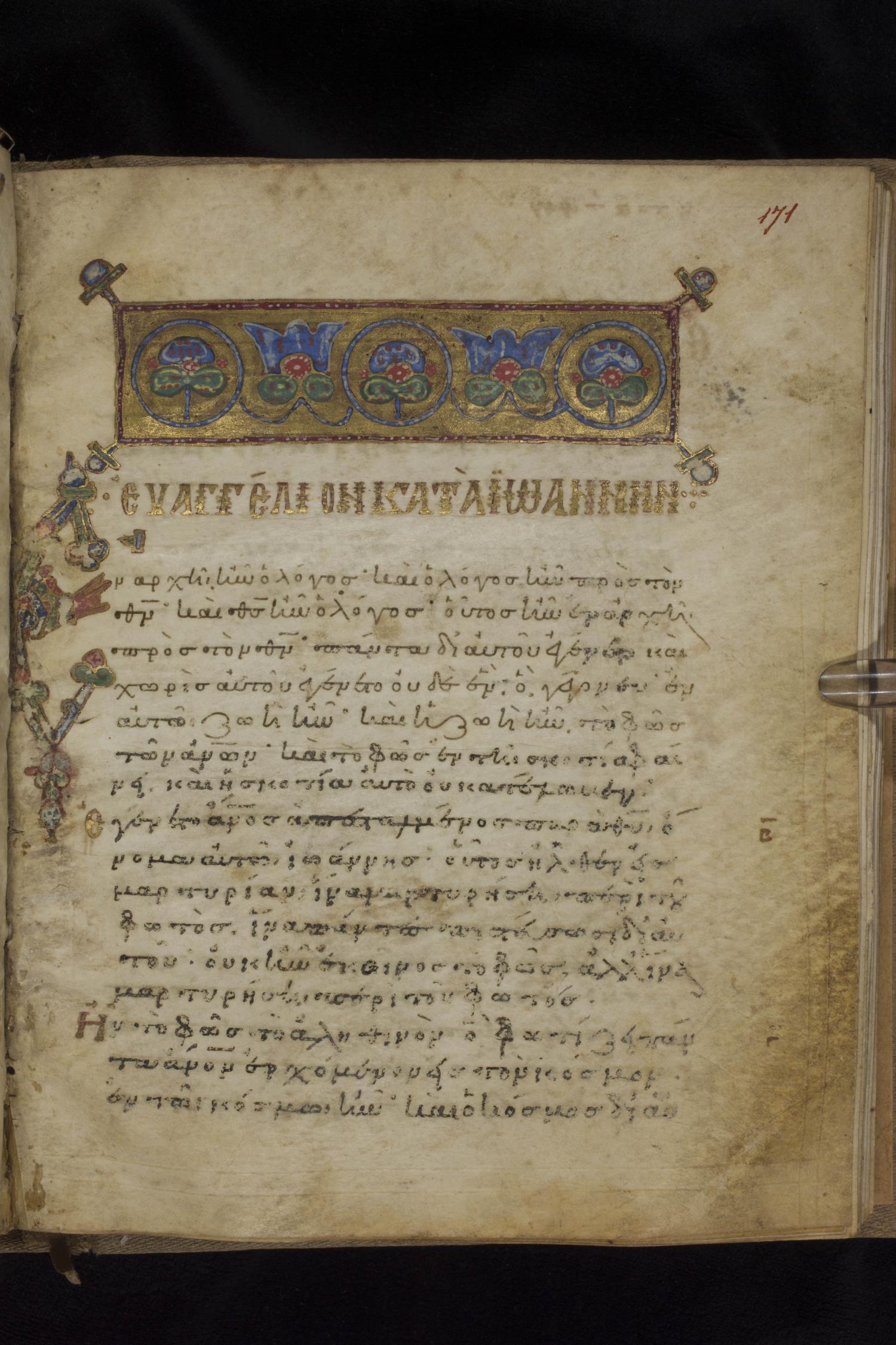 Eleventh century minuscule of the Gospels on parchment; 231 leaves, 1 column, 24 lines per column. Images were taken at the National Library of Greece in Athens.