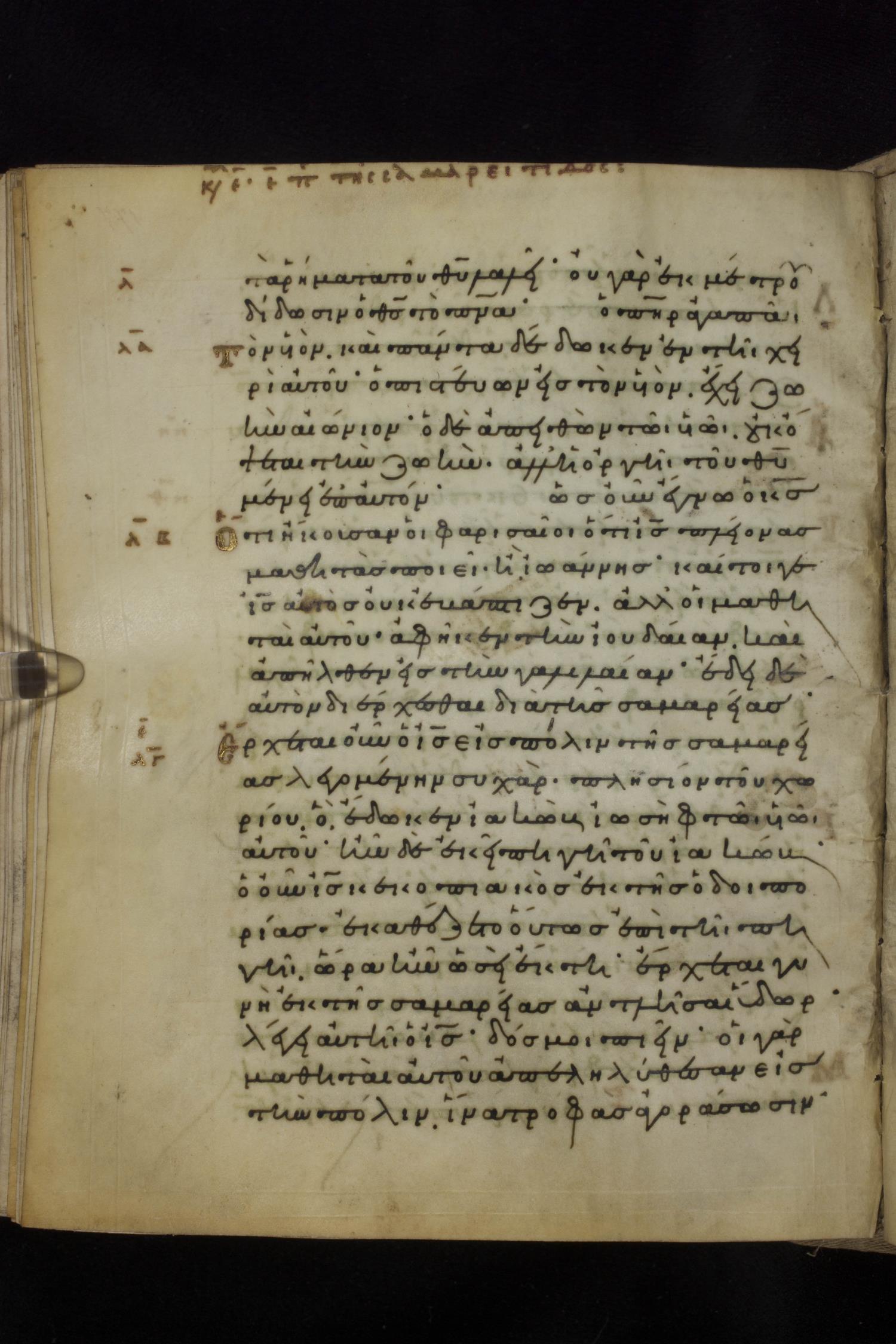 Eleventh century minuscule of the Gospels on parchment; 231 leaves, 1 column, 24 lines per column. Images were taken at the National Library of Greece in Athens.