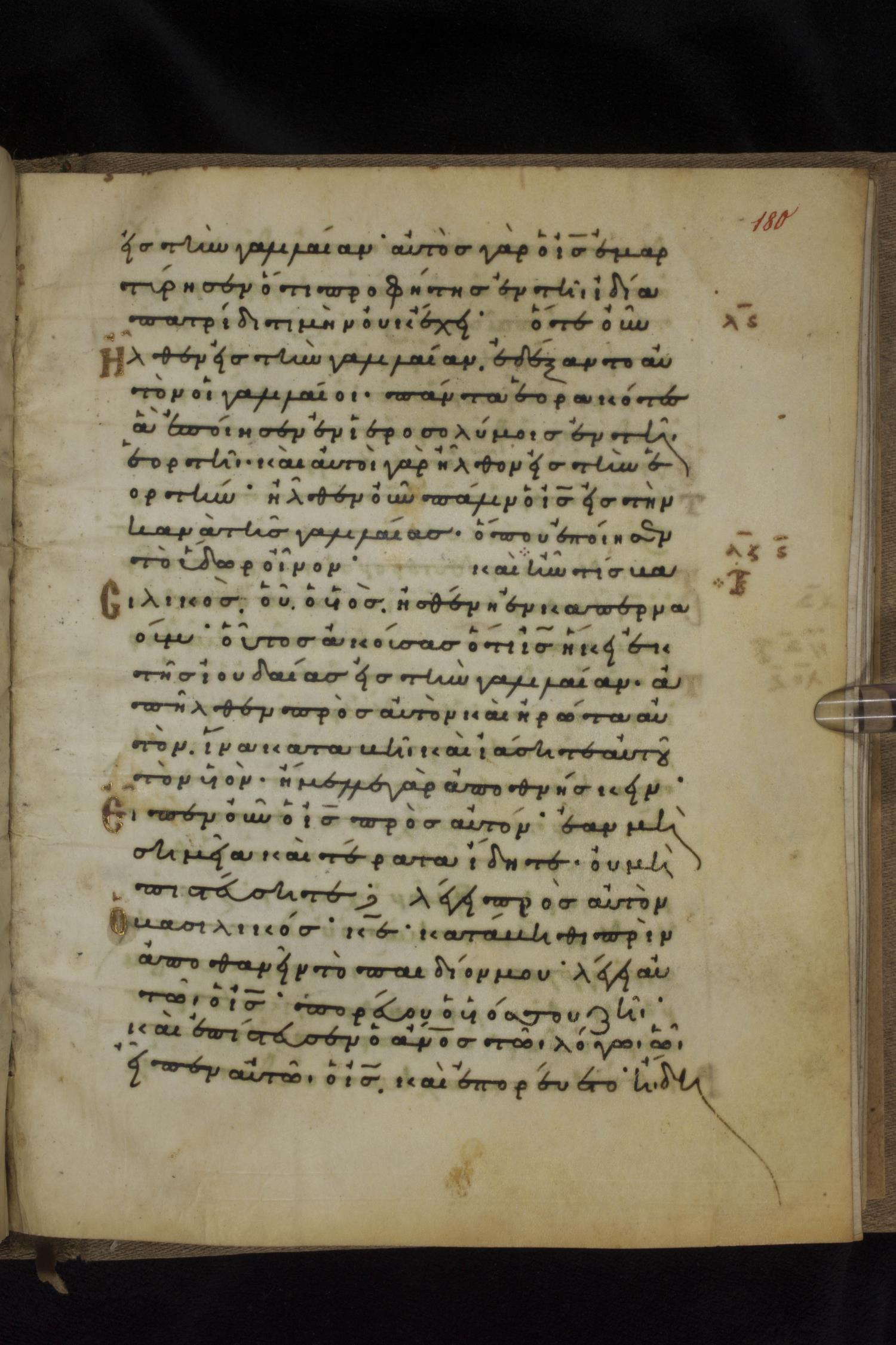 Eleventh century minuscule of the Gospels on parchment; 231 leaves, 1 column, 24 lines per column. Images were taken at the National Library of Greece in Athens.