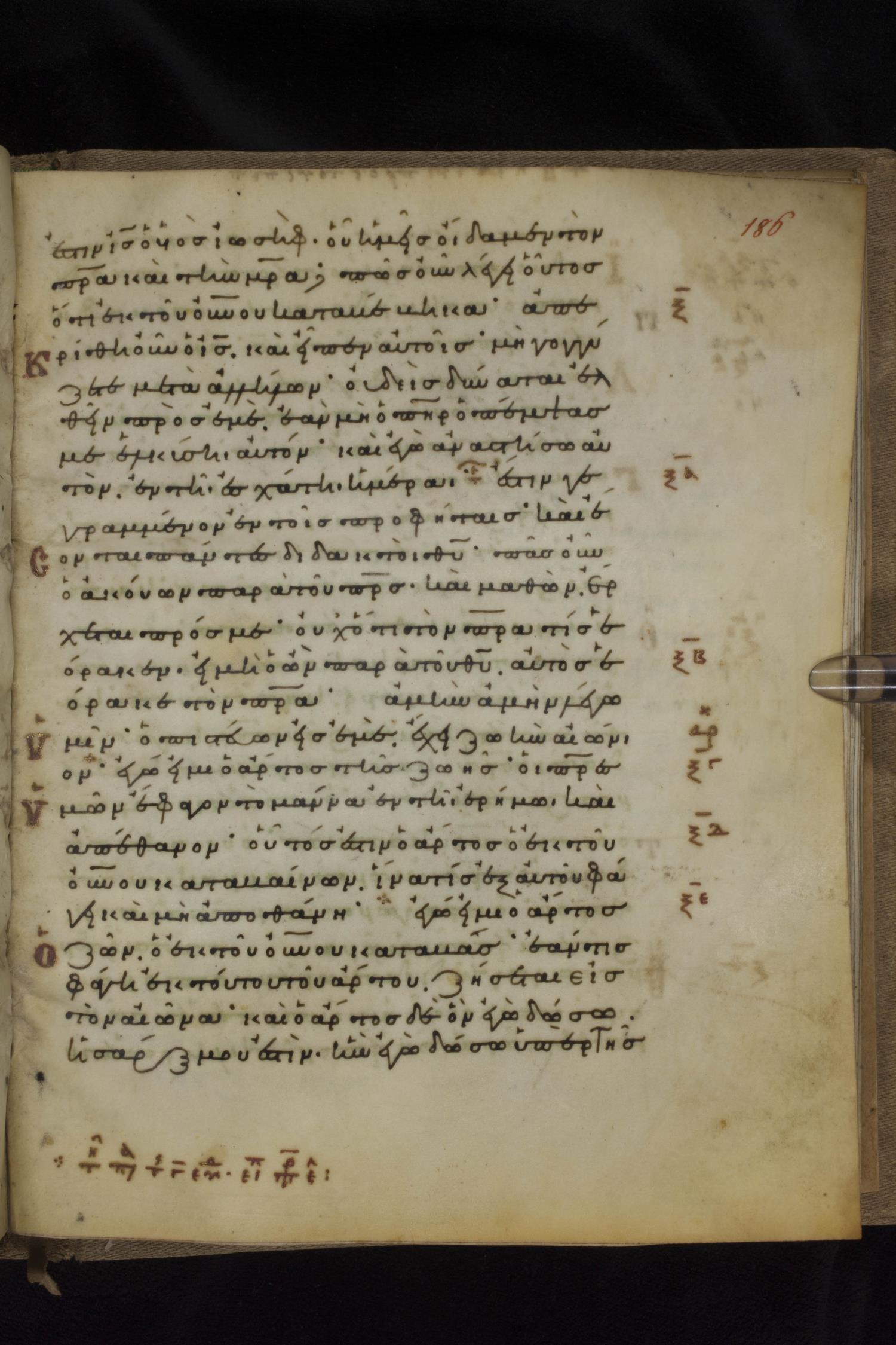 Eleventh century minuscule of the Gospels on parchment; 231 leaves, 1 column, 24 lines per column. Images were taken at the National Library of Greece in Athens.