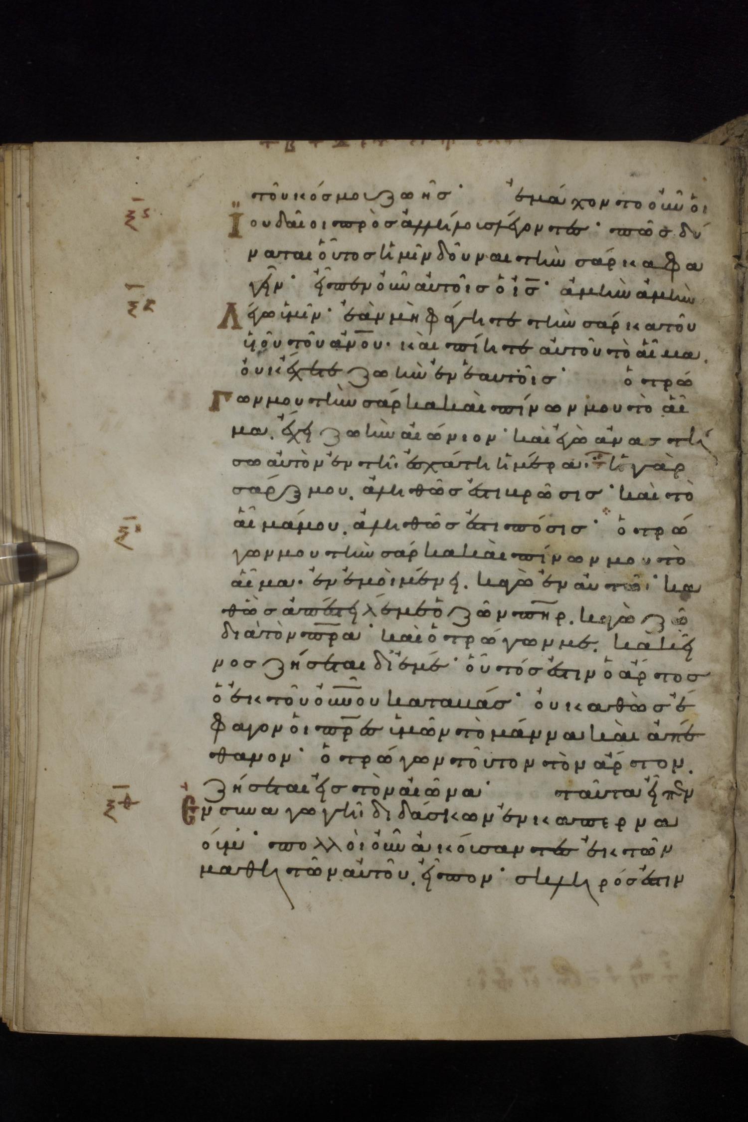 Eleventh century minuscule of the Gospels on parchment; 231 leaves, 1 column, 24 lines per column. Images were taken at the National Library of Greece in Athens.