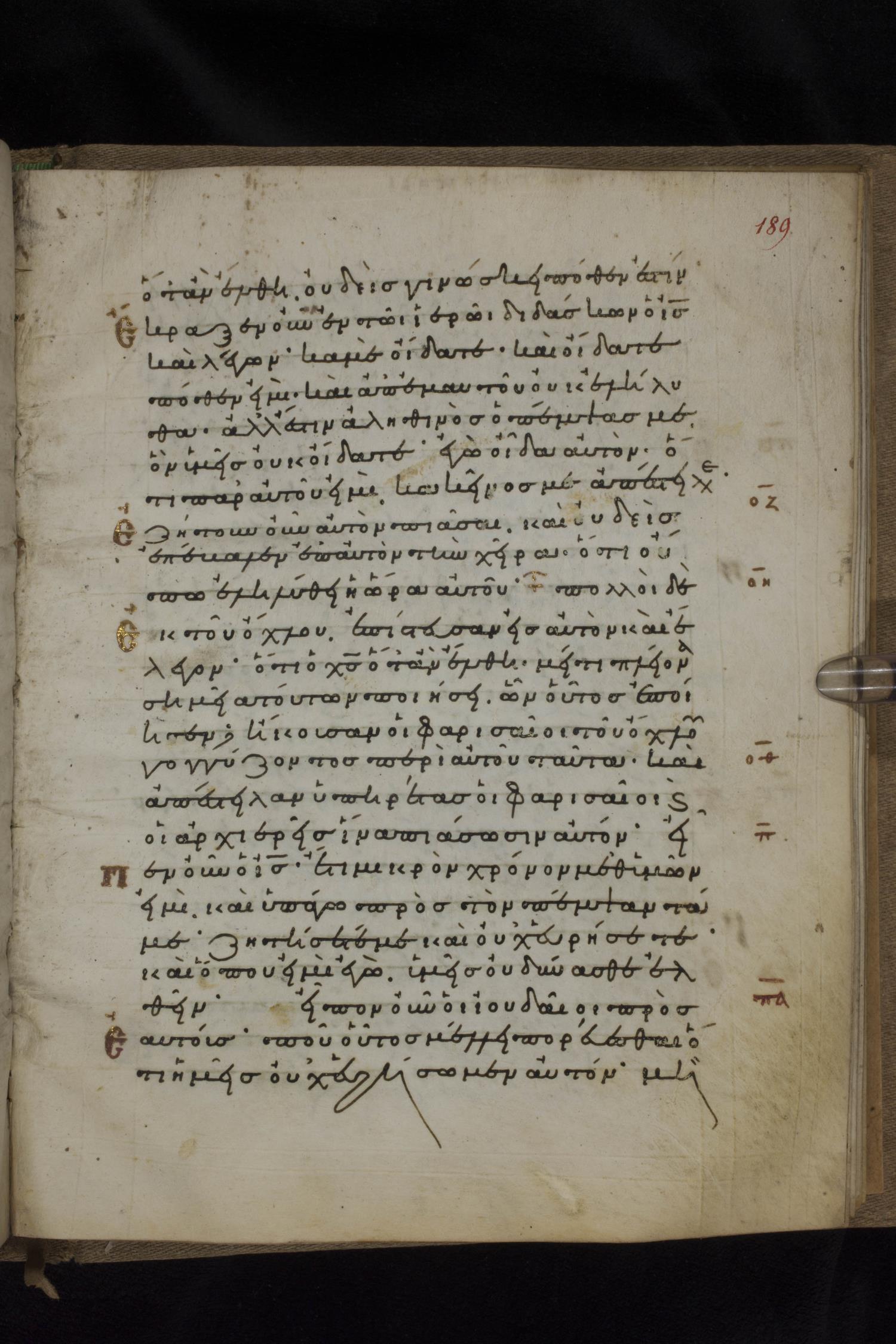 Eleventh century minuscule of the Gospels on parchment; 231 leaves, 1 column, 24 lines per column. Images were taken at the National Library of Greece in Athens.