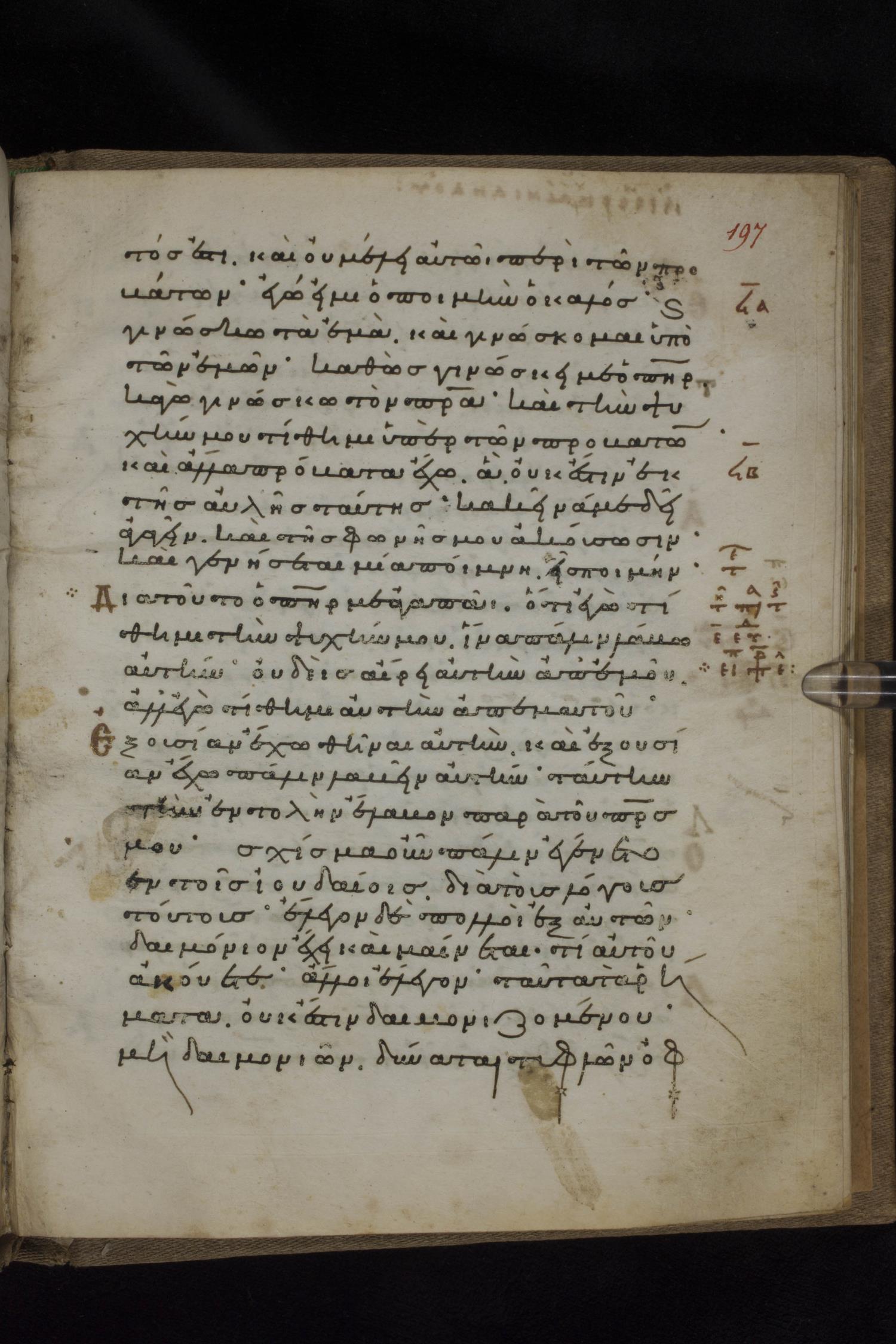 Eleventh century minuscule of the Gospels on parchment; 231 leaves, 1 column, 24 lines per column. Images were taken at the National Library of Greece in Athens.
