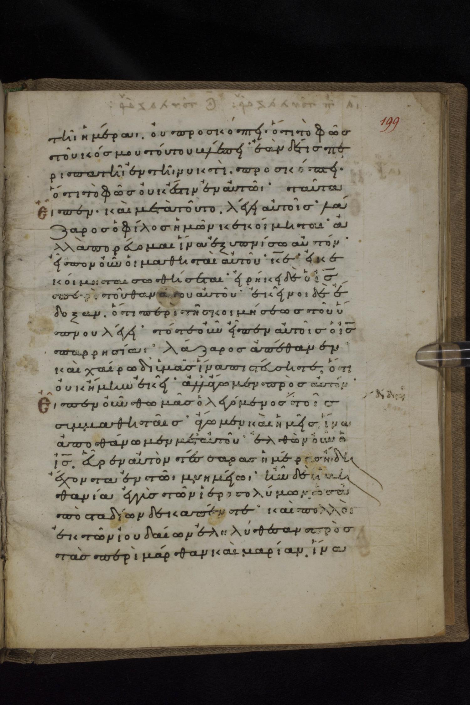 Eleventh century minuscule of the Gospels on parchment; 231 leaves, 1 column, 24 lines per column. Images were taken at the National Library of Greece in Athens.