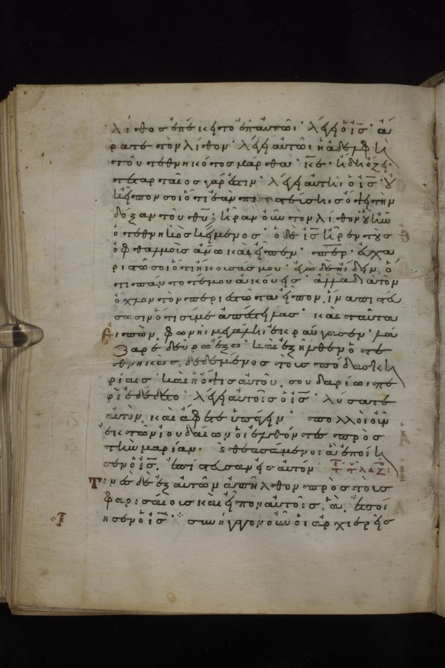 Eleventh century minuscule of the Gospels on parchment; 231 leaves, 1 column, 24 lines per column. Images were taken at the National Library of Greece in Athens.