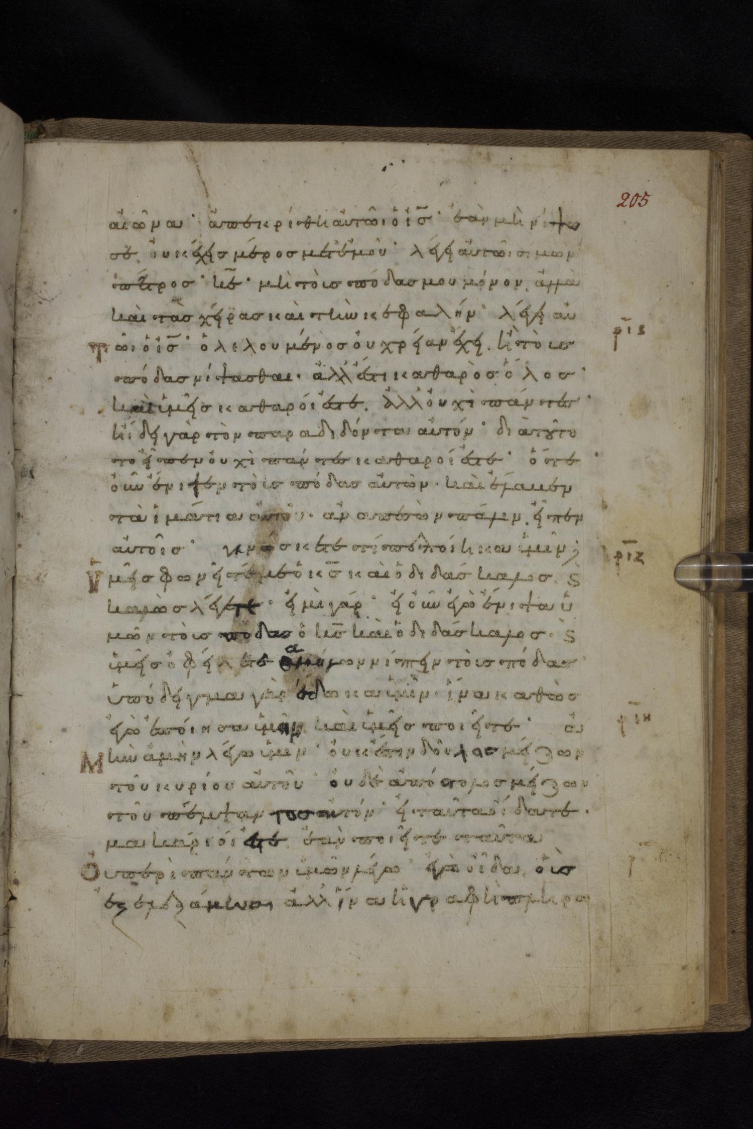 Eleventh century minuscule of the Gospels on parchment; 231 leaves, 1 column, 24 lines per column. Images were taken at the National Library of Greece in Athens.
