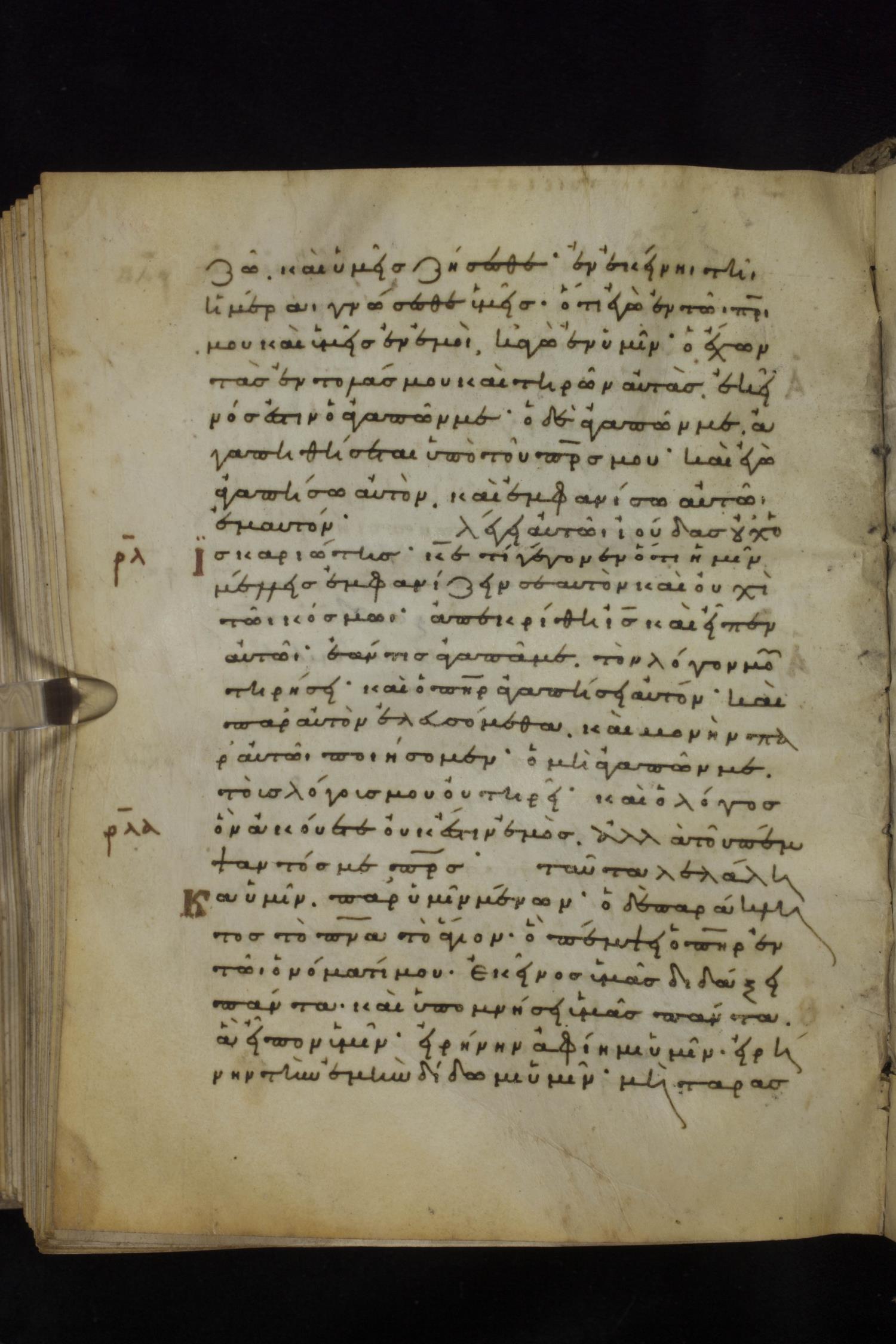 Eleventh century minuscule of the Gospels on parchment; 231 leaves, 1 column, 24 lines per column. Images were taken at the National Library of Greece in Athens.
