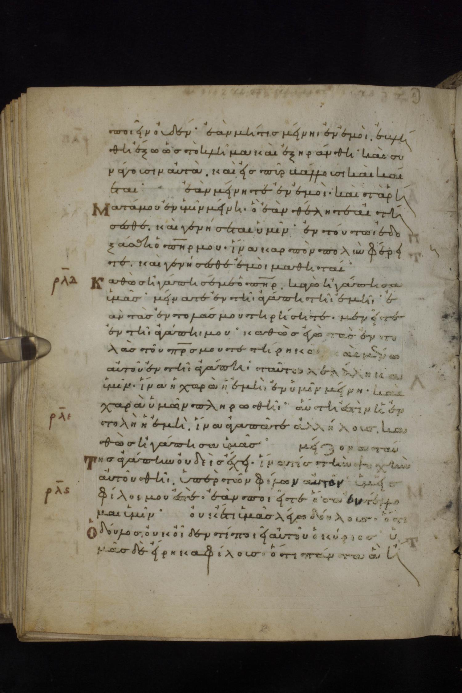 Eleventh century minuscule of the Gospels on parchment; 231 leaves, 1 column, 24 lines per column. Images were taken at the National Library of Greece in Athens.