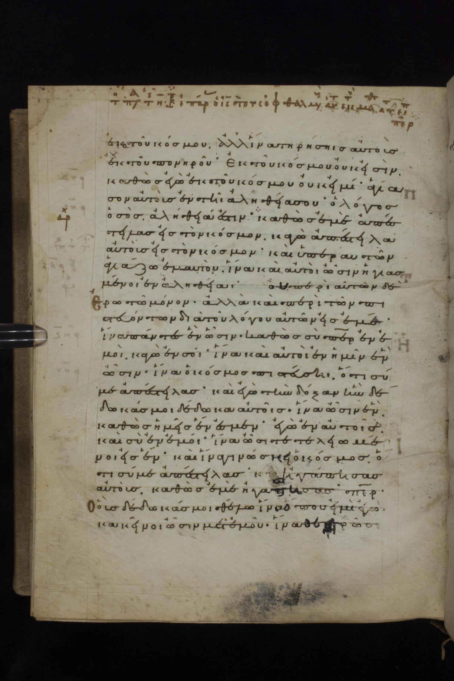 Eleventh century minuscule of the Gospels on parchment; 231 leaves, 1 column, 24 lines per column. Images were taken at the National Library of Greece in Athens.