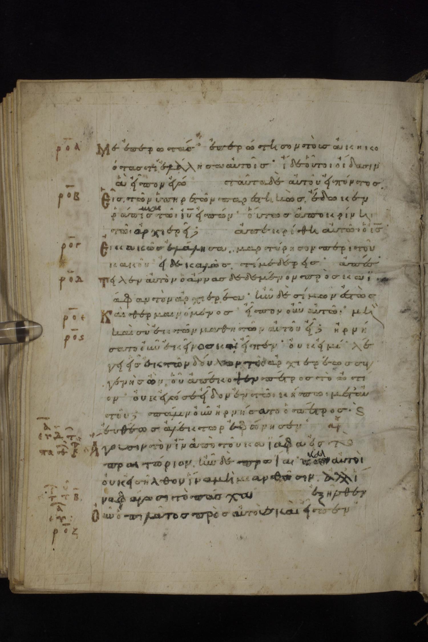 Eleventh century minuscule of the Gospels on parchment; 231 leaves, 1 column, 24 lines per column. Images were taken at the National Library of Greece in Athens.