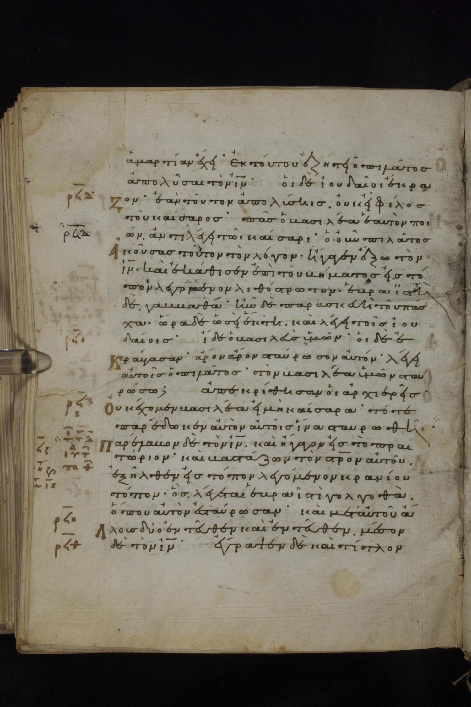 Eleventh century minuscule of the Gospels on parchment; 231 leaves, 1 column, 24 lines per column. Images were taken at the National Library of Greece in Athens.