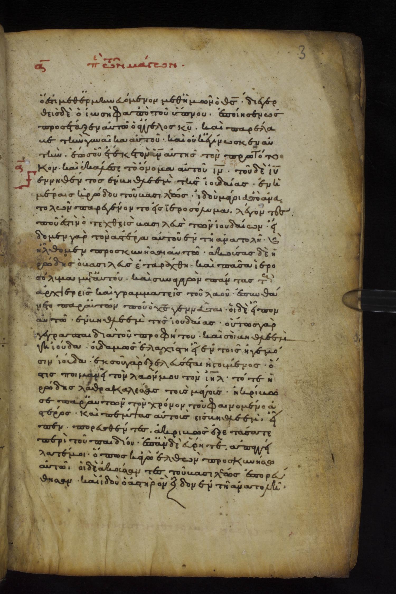 Twelfth century minuscule dated to 1145 of the Gospels on parchment and paper; 189 leaves, 1 column, 22-29 lines per page. Images were taken at the National Library of Greece in Athens.