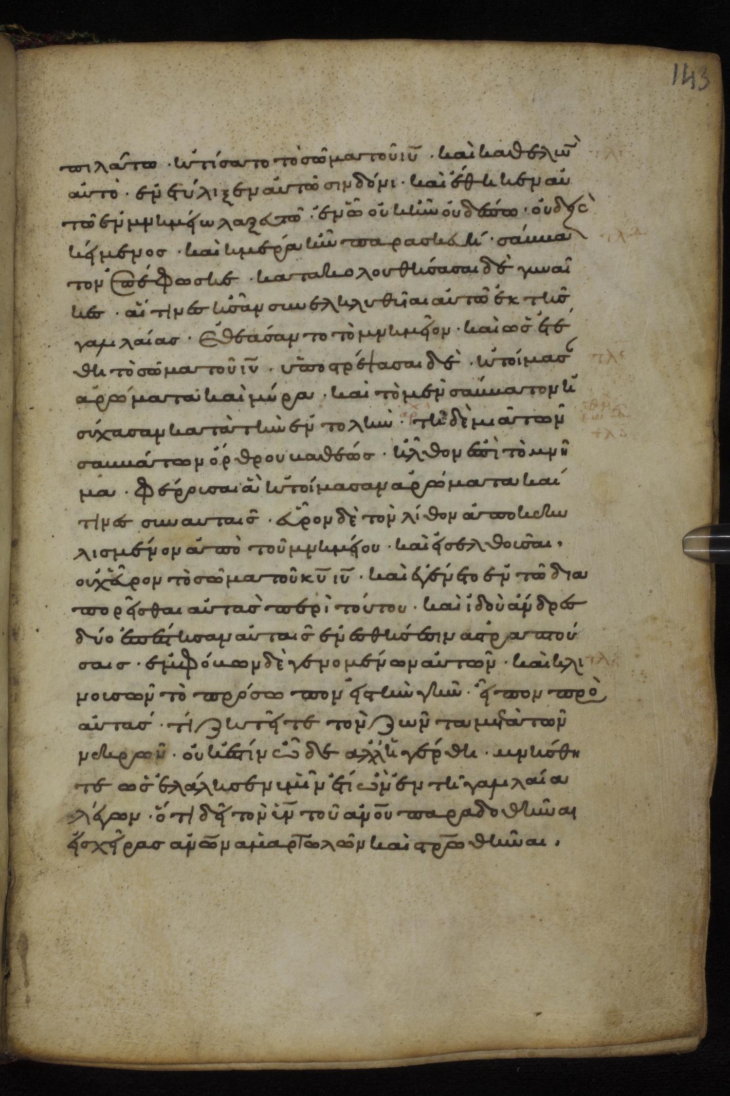 Twelfth century minuscule dated to 1145 of the Gospels on parchment and paper; 189 leaves, 1 column, 22-29 lines per page. Images were taken at the National Library of Greece in Athens.