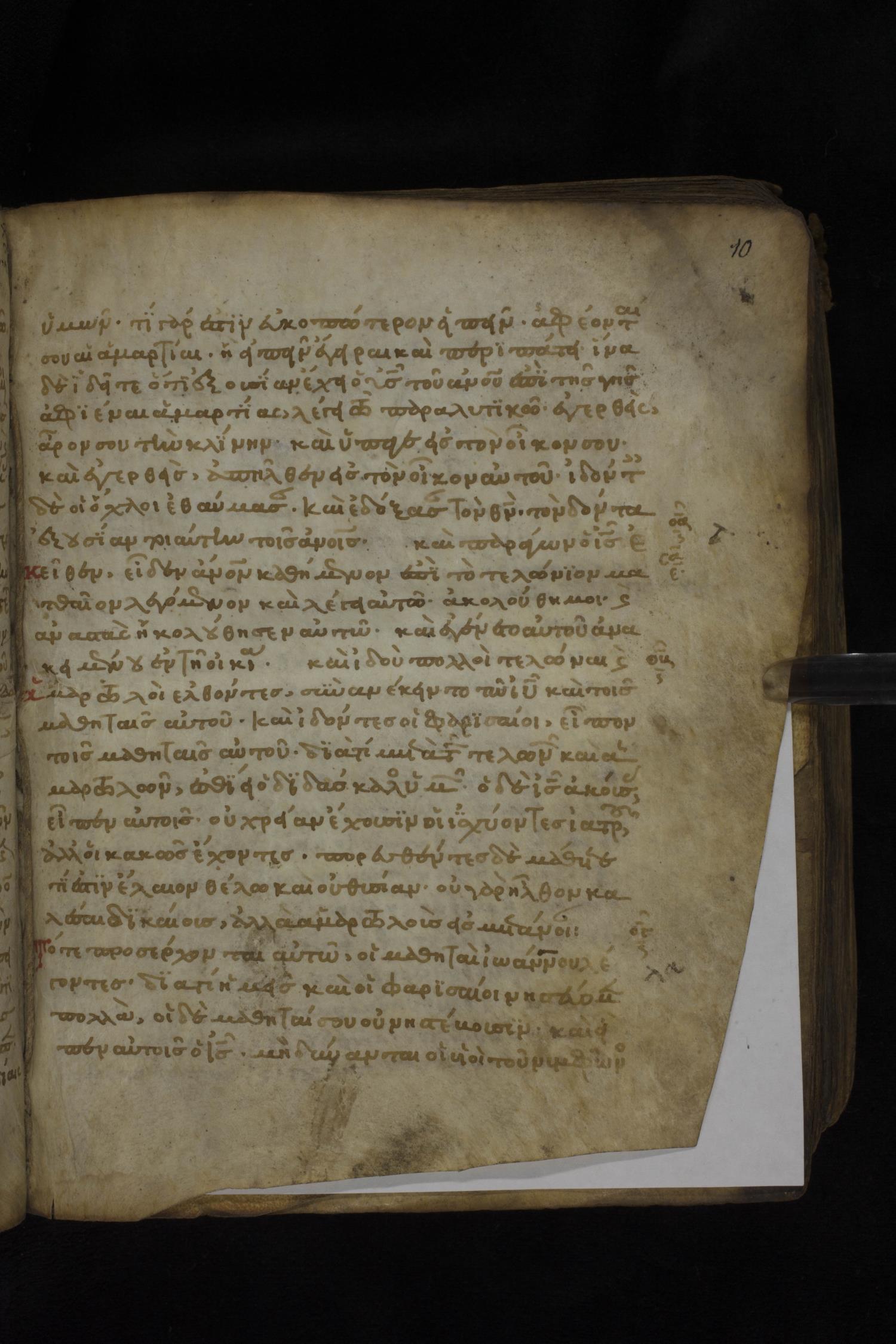 Twelfth century minuscule of the Gospels on parchment; 181 leaves, 1 column, 23-24 lines per column. Images were taken at the National Library of Greece in Athens.