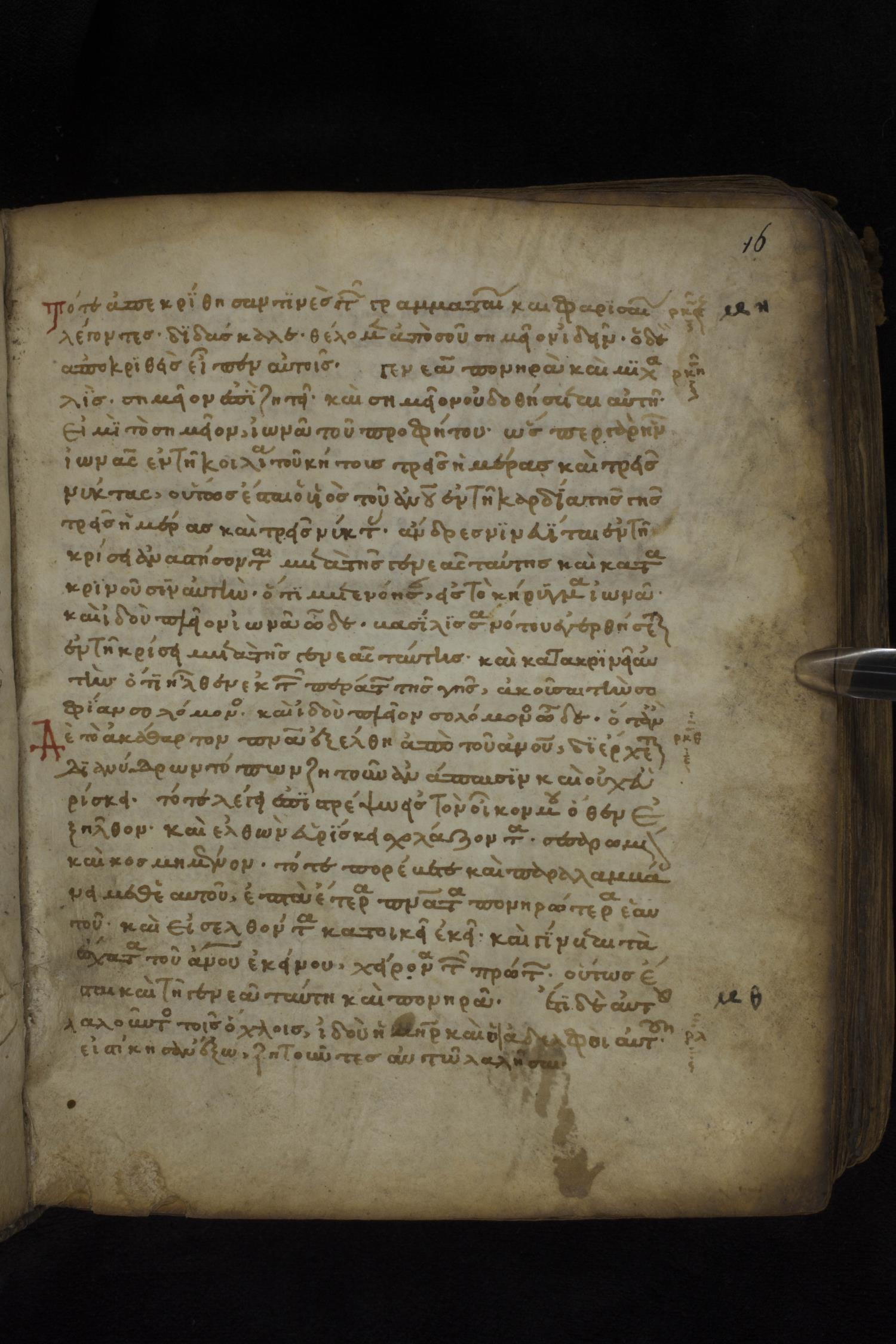 Twelfth century minuscule of the Gospels on parchment; 181 leaves, 1 column, 23-24 lines per column. Images were taken at the National Library of Greece in Athens.