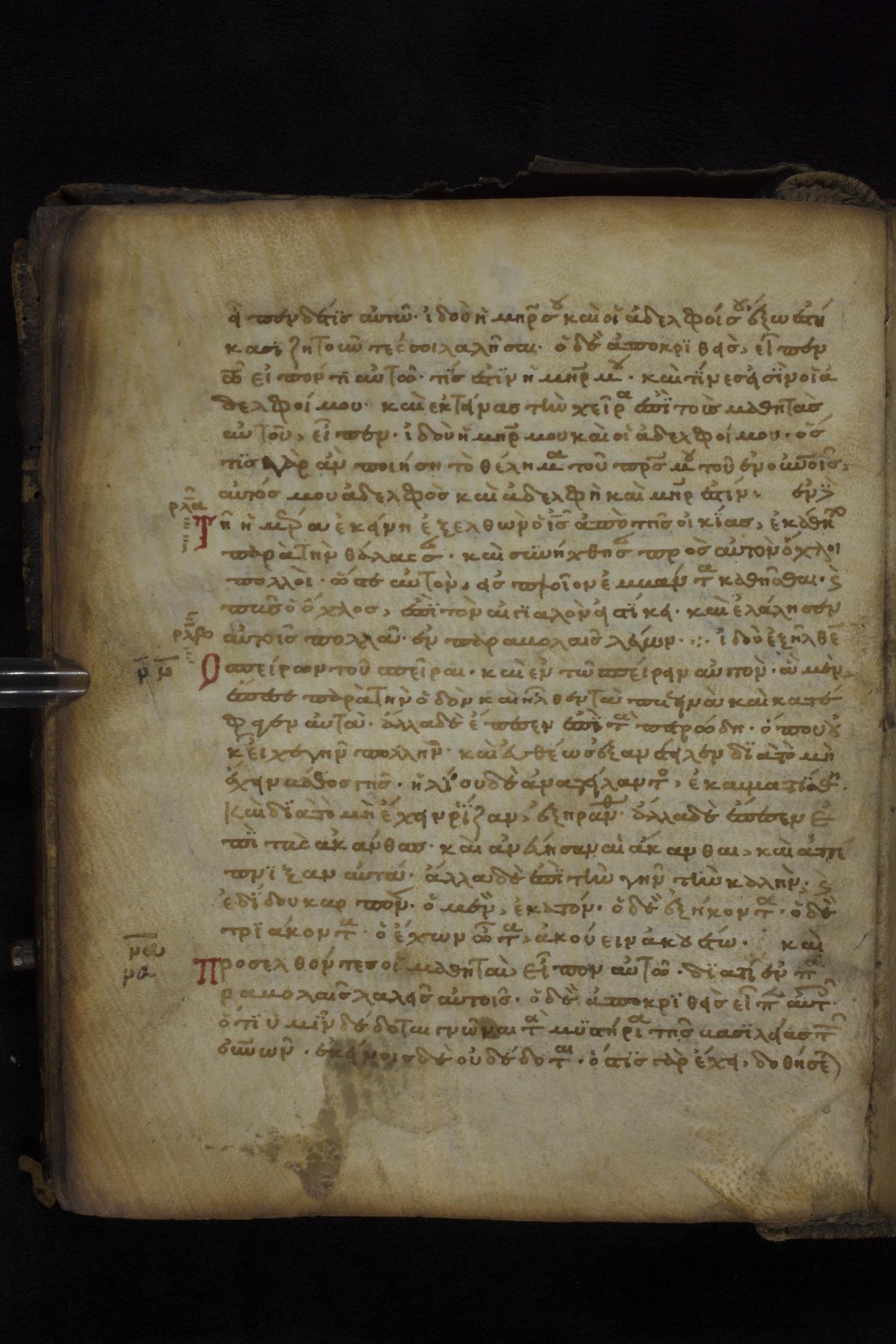 Twelfth century minuscule of the Gospels on parchment; 181 leaves, 1 column, 23-24 lines per column. Images were taken at the National Library of Greece in Athens.