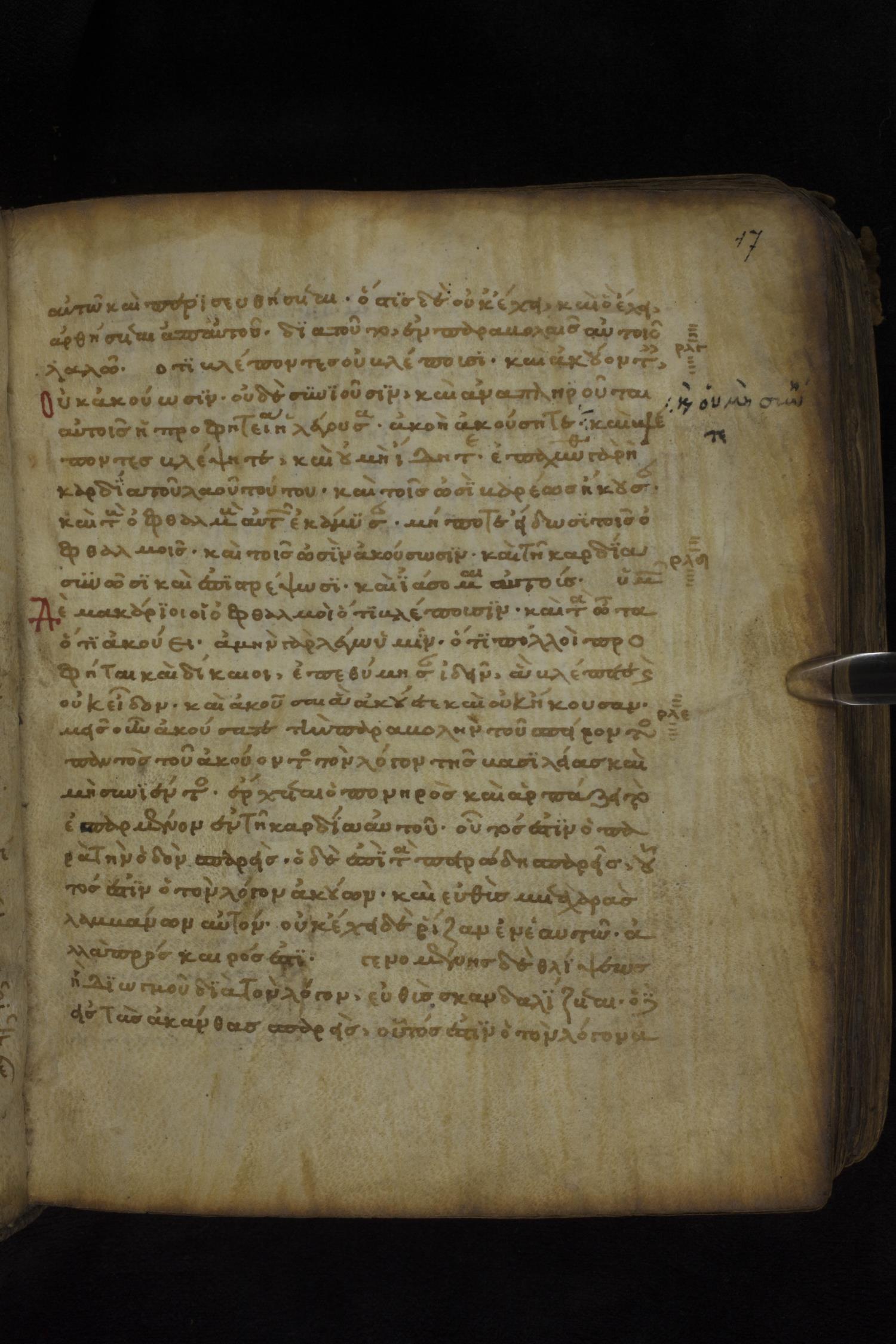 Twelfth century minuscule of the Gospels on parchment; 181 leaves, 1 column, 23-24 lines per column. Images were taken at the National Library of Greece in Athens.