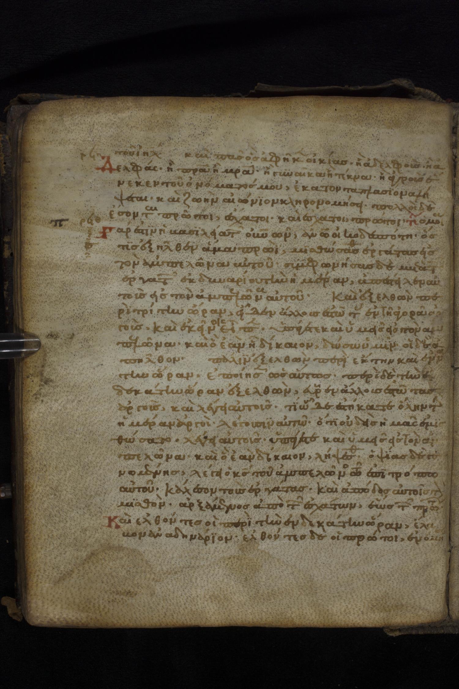 Twelfth century minuscule of the Gospels on parchment; 181 leaves, 1 column, 23-24 lines per column. Images were taken at the National Library of Greece in Athens.