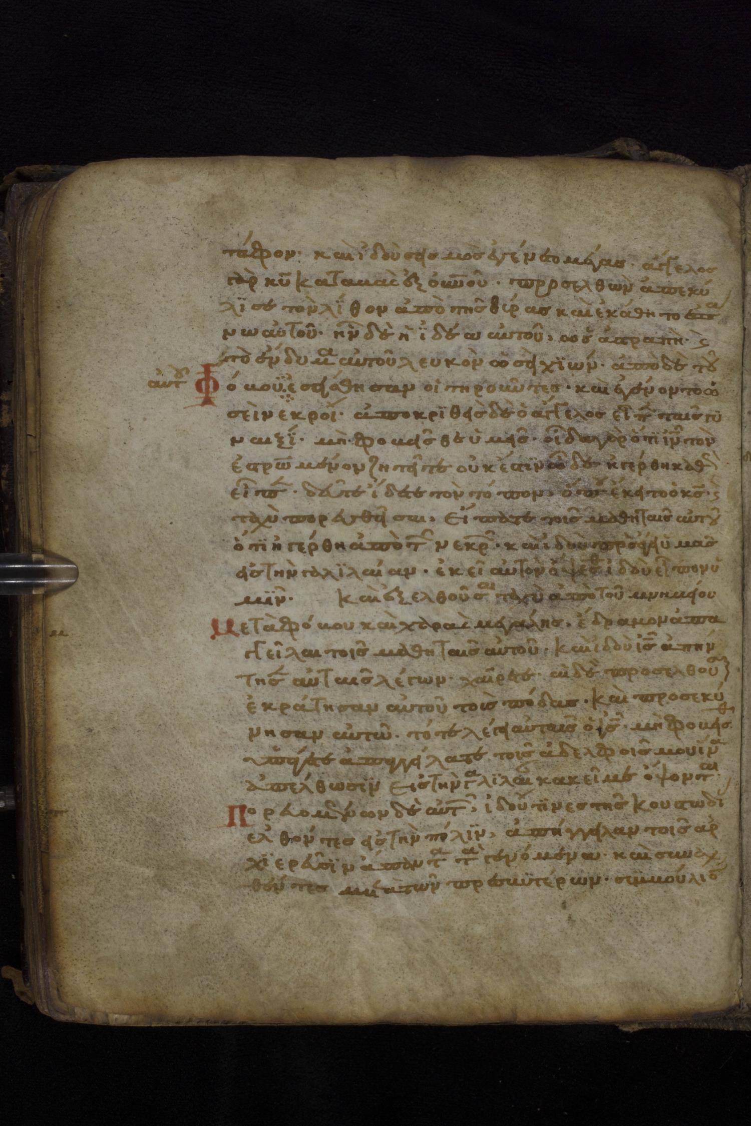 Twelfth century minuscule of the Gospels on parchment; 181 leaves, 1 column, 23-24 lines per column. Images were taken at the National Library of Greece in Athens.