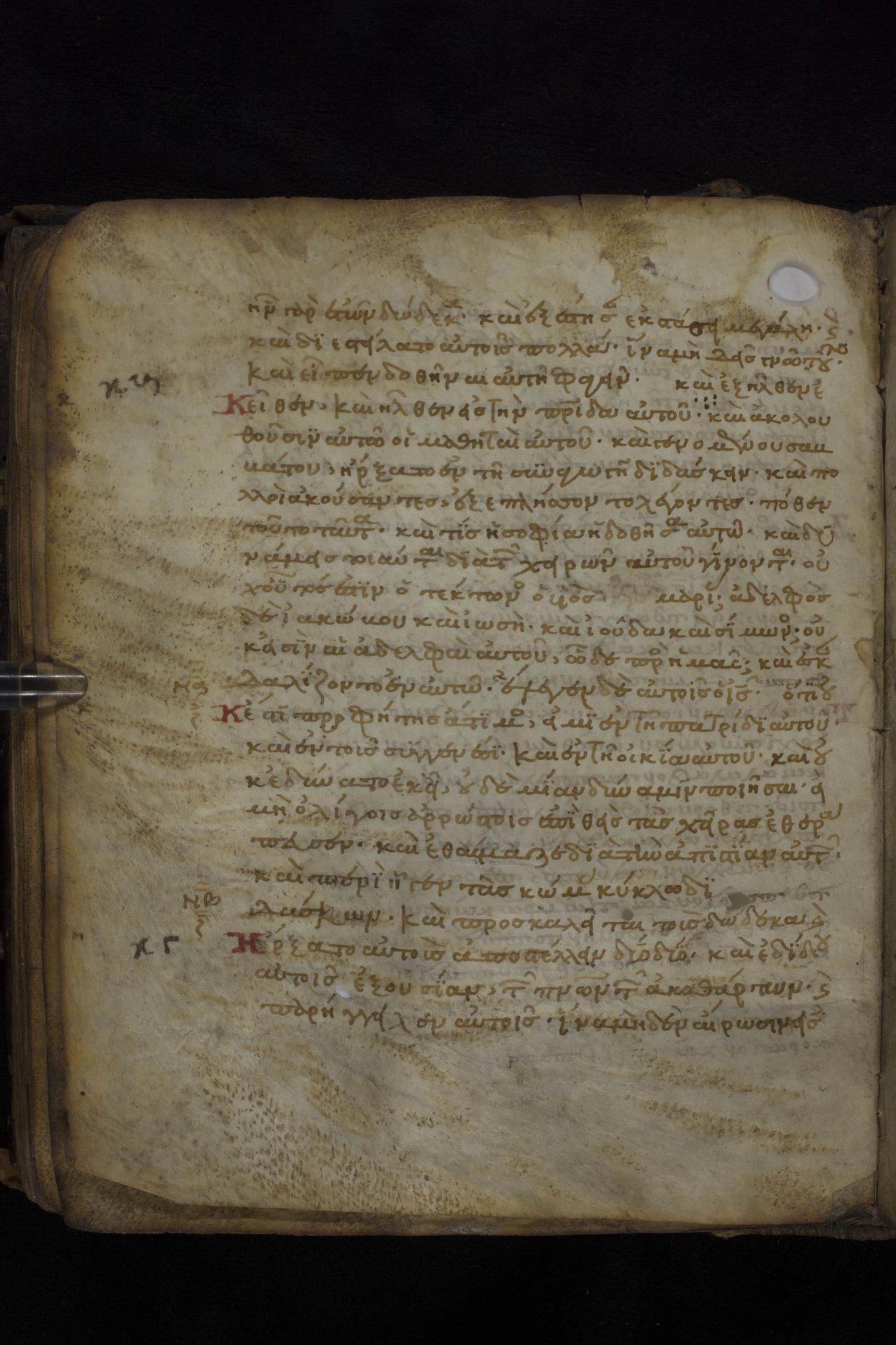 Twelfth century minuscule of the Gospels on parchment; 181 leaves, 1 column, 23-24 lines per column. Images were taken at the National Library of Greece in Athens.