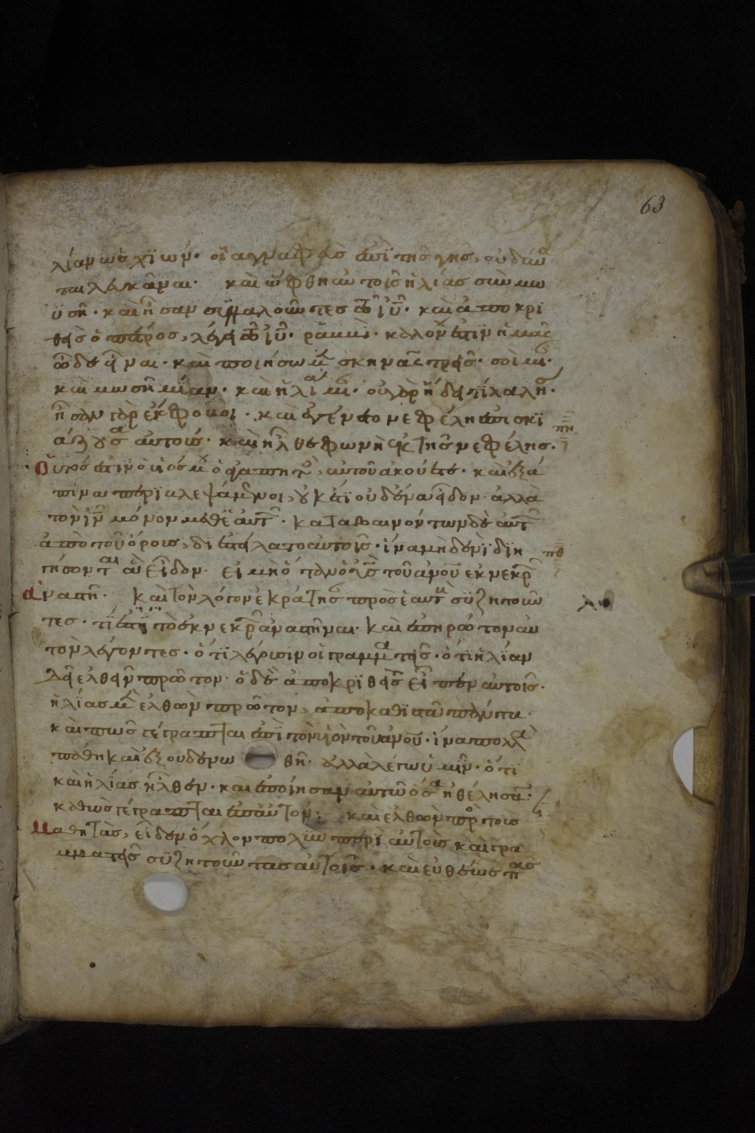 Twelfth century minuscule of the Gospels on parchment; 181 leaves, 1 column, 23-24 lines per column. Images were taken at the National Library of Greece in Athens.