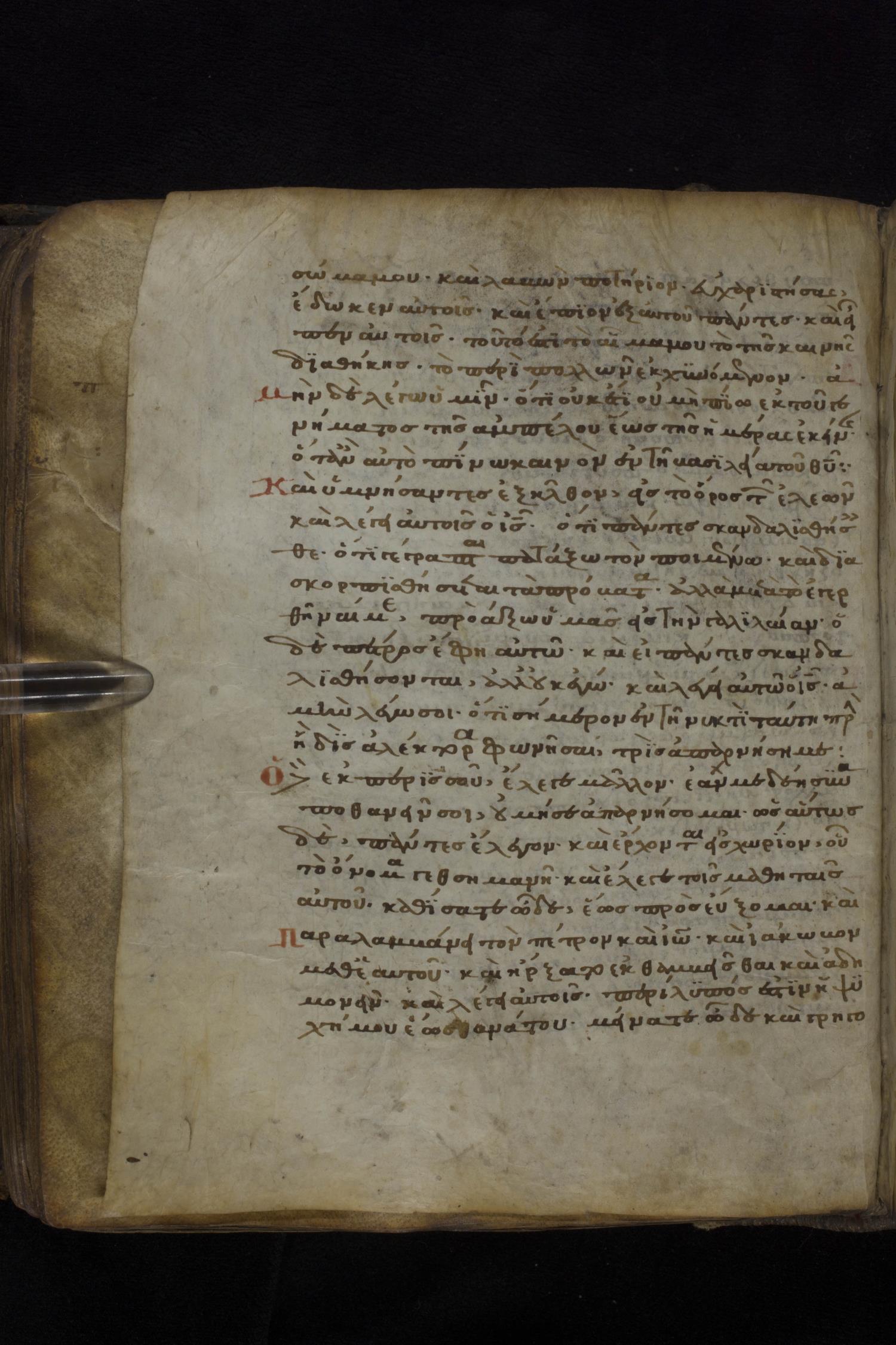 Twelfth century minuscule of the Gospels on parchment; 181 leaves, 1 column, 23-24 lines per column. Images were taken at the National Library of Greece in Athens.