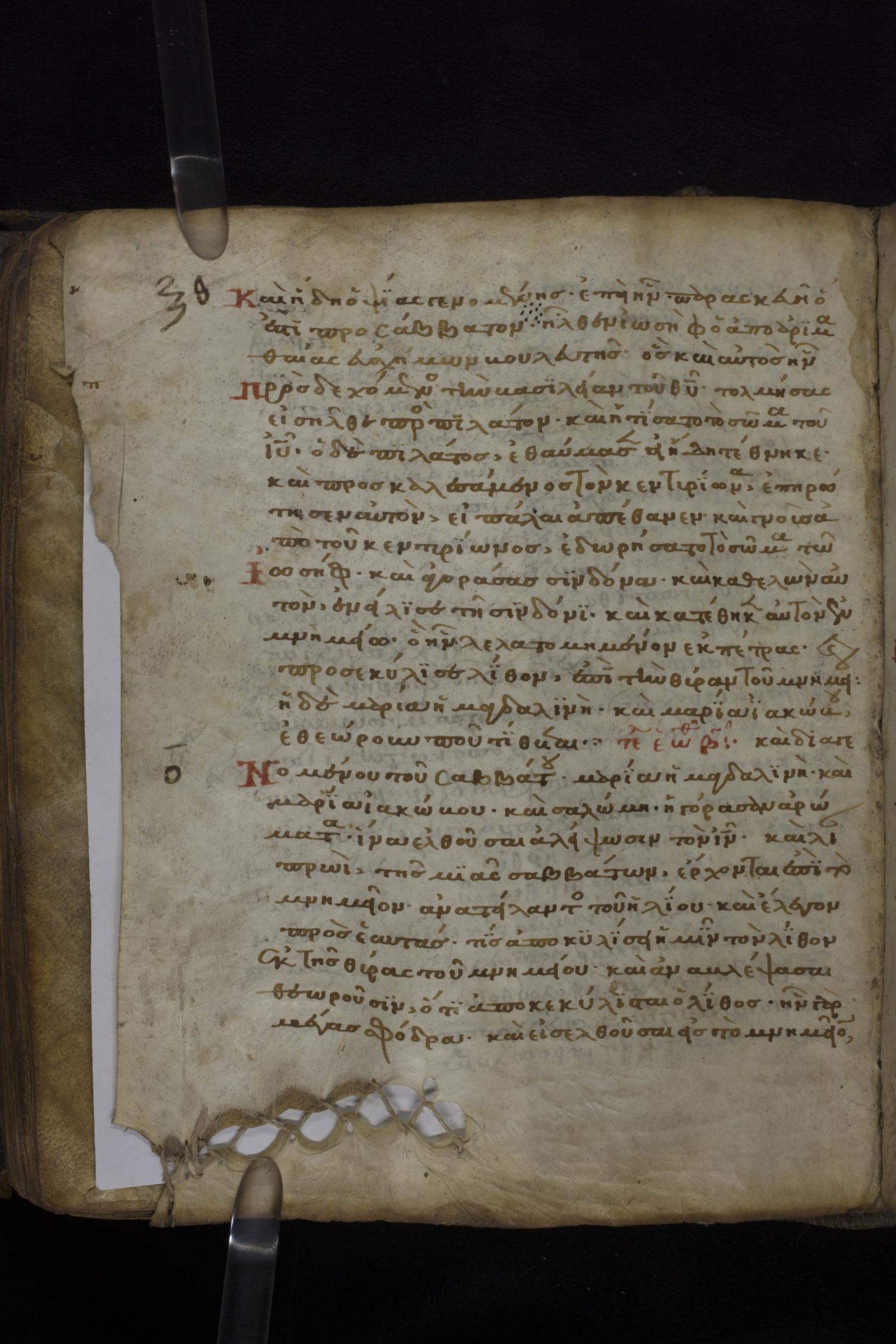 Twelfth century minuscule of the Gospels on parchment; 181 leaves, 1 column, 23-24 lines per column. Images were taken at the National Library of Greece in Athens.