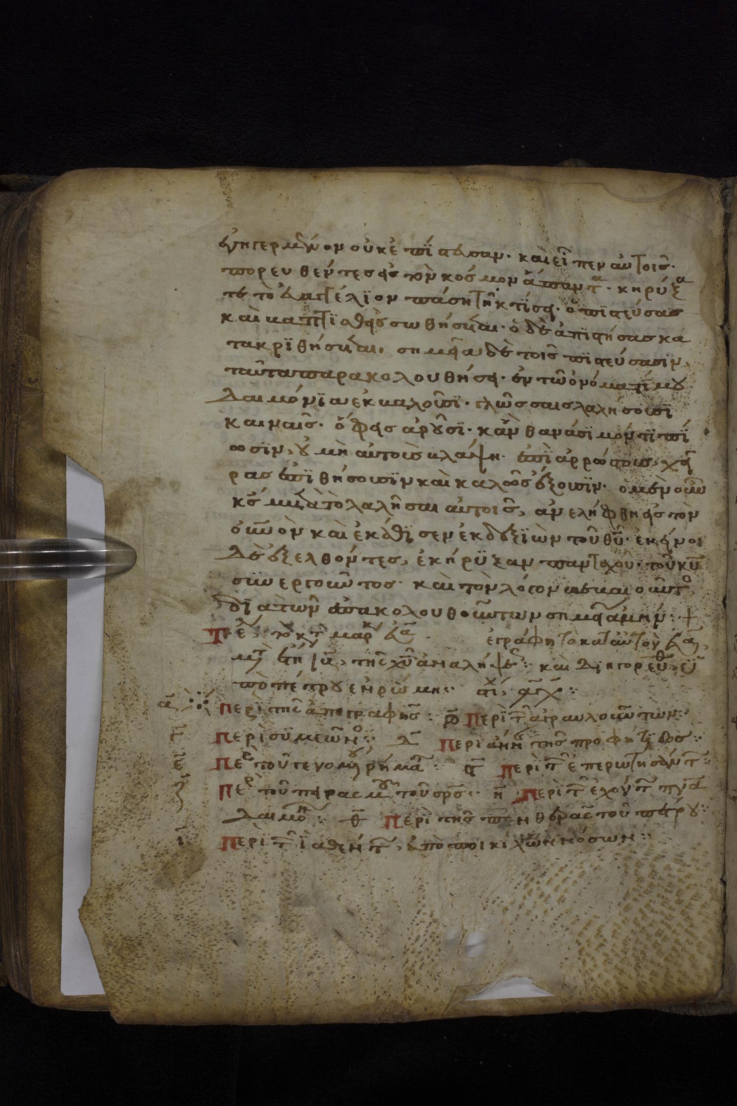 Twelfth century minuscule of the Gospels on parchment; 181 leaves, 1 column, 23-24 lines per column. Images were taken at the National Library of Greece in Athens.