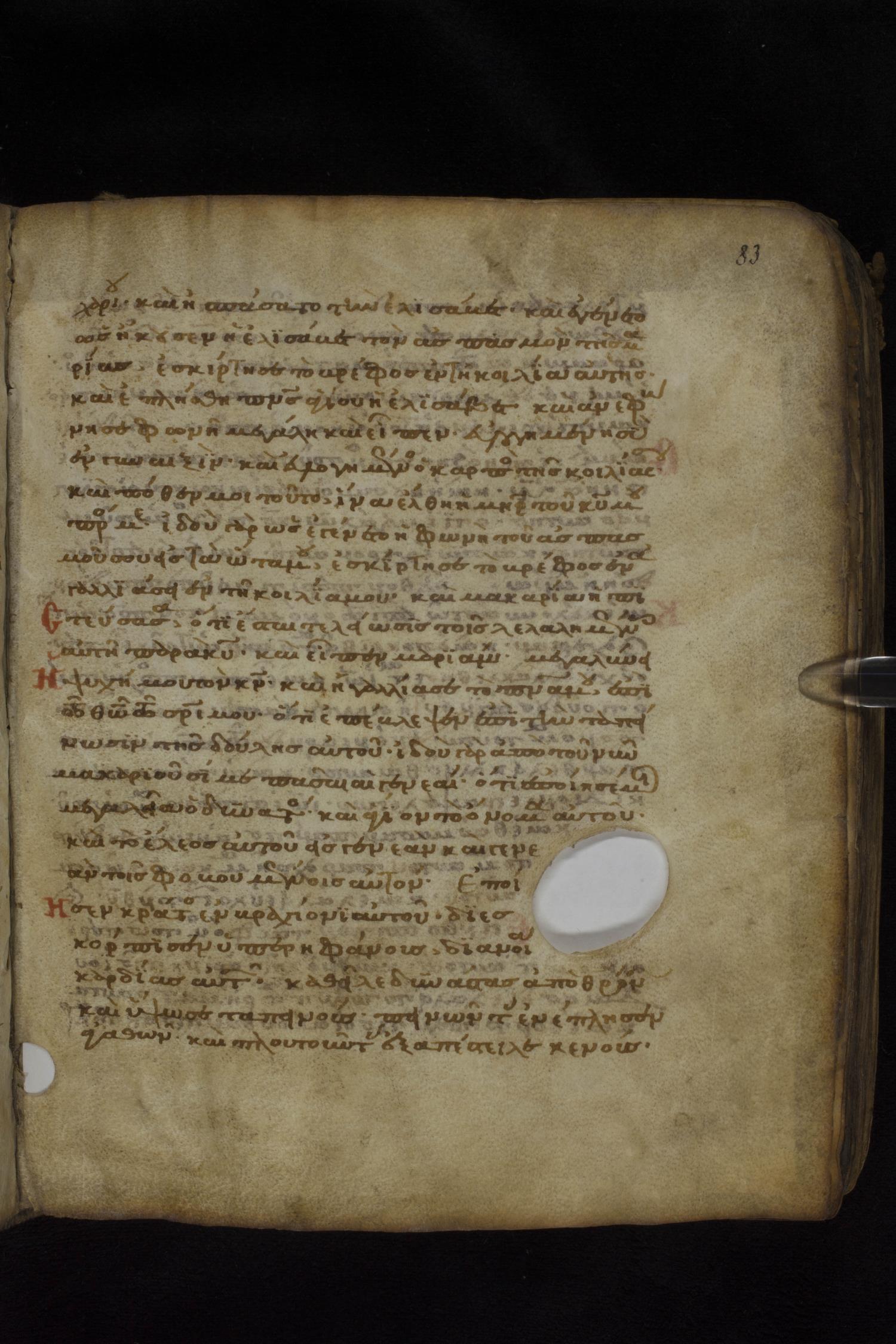 Twelfth century minuscule of the Gospels on parchment; 181 leaves, 1 column, 23-24 lines per column. Images were taken at the National Library of Greece in Athens.