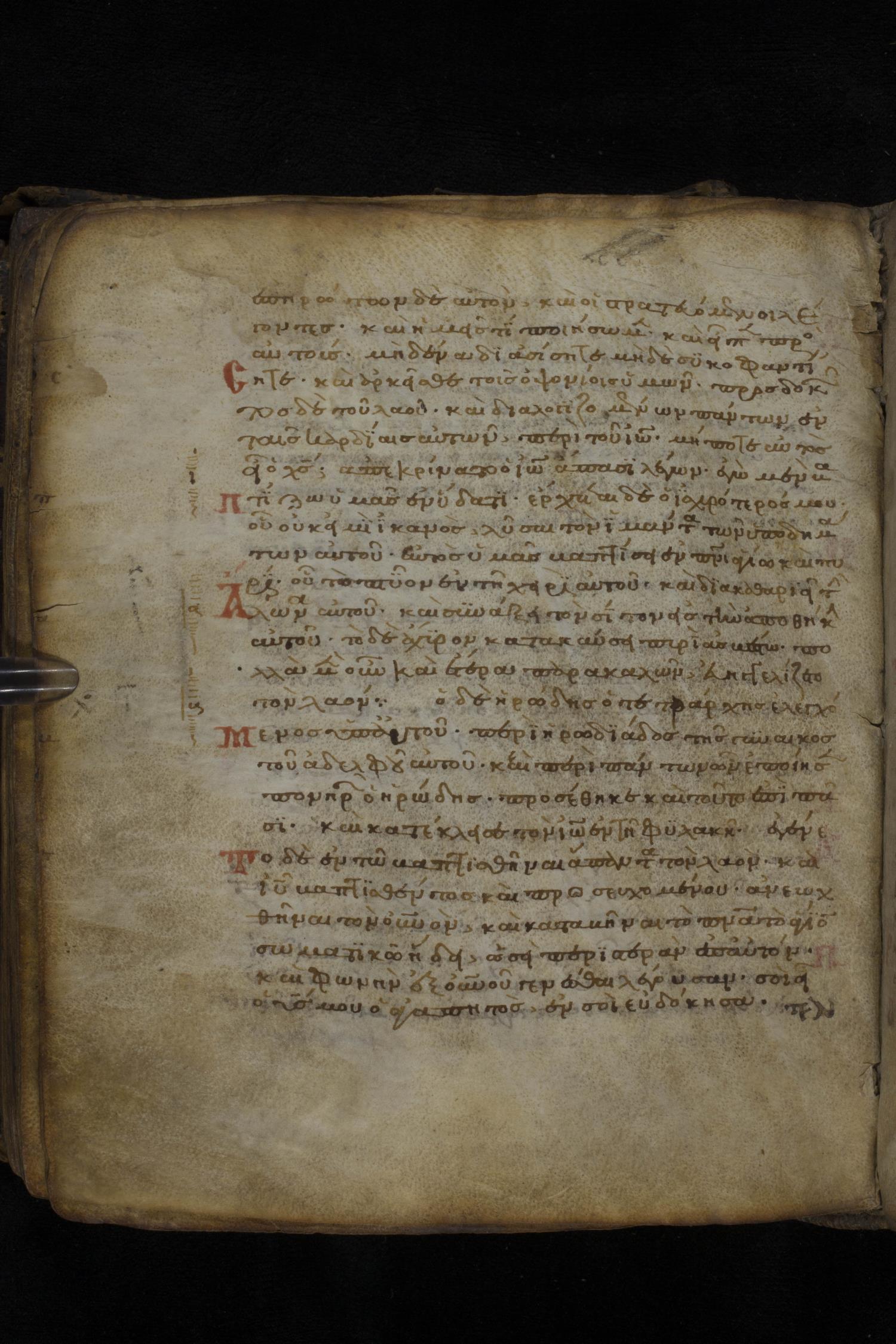 Twelfth century minuscule of the Gospels on parchment; 181 leaves, 1 column, 23-24 lines per column. Images were taken at the National Library of Greece in Athens.