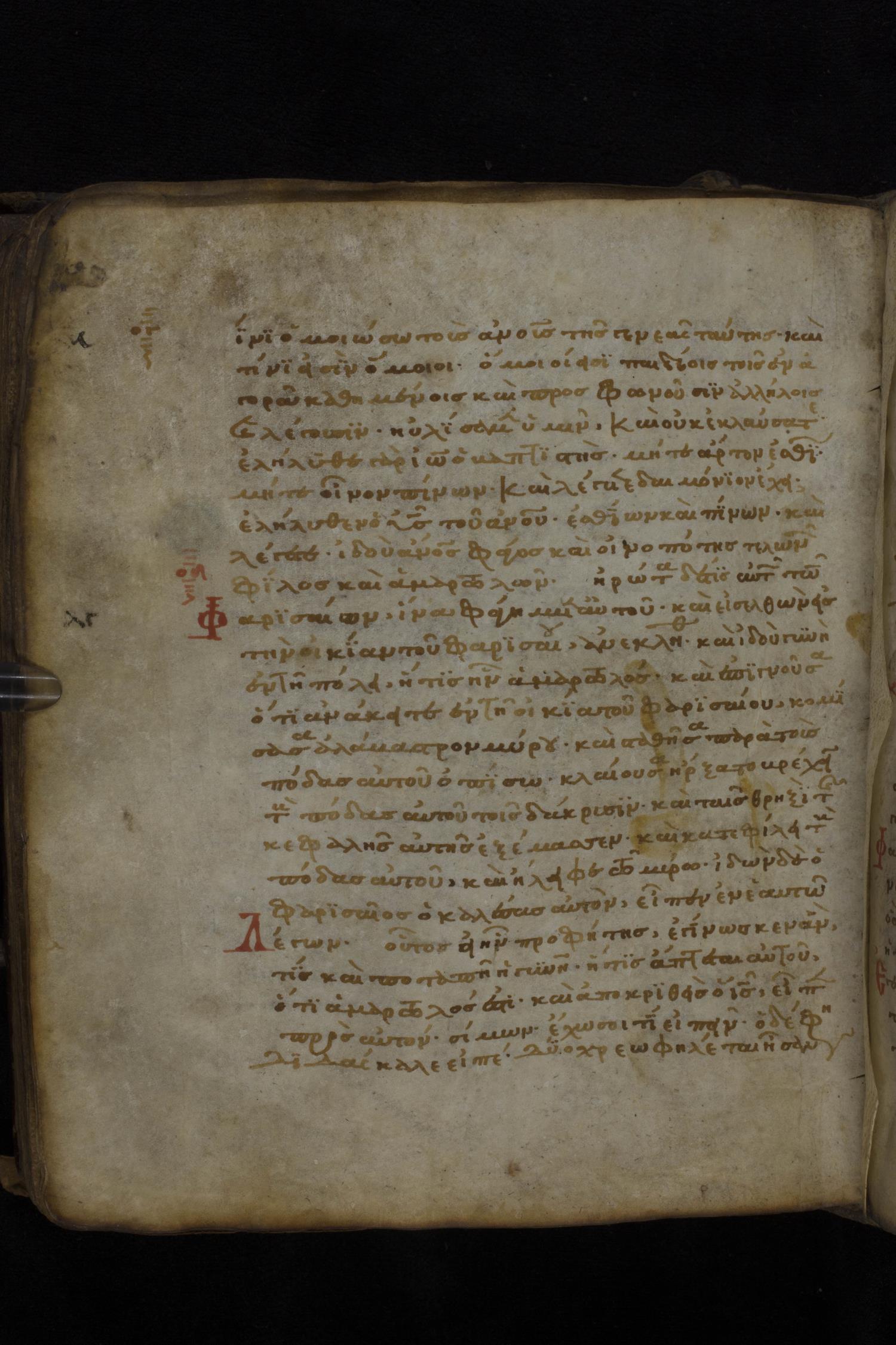 Twelfth century minuscule of the Gospels on parchment; 181 leaves, 1 column, 23-24 lines per column. Images were taken at the National Library of Greece in Athens.