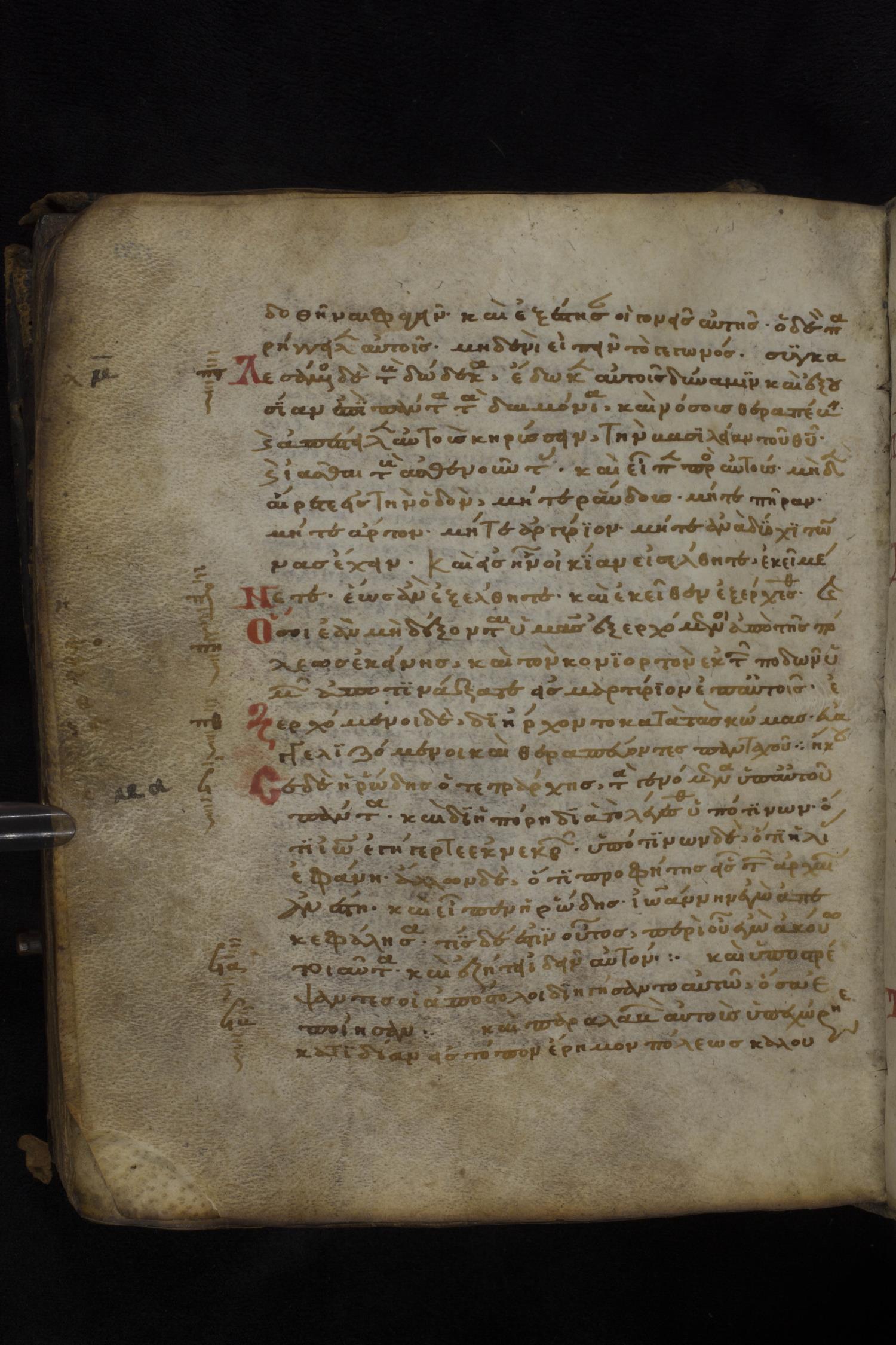 Twelfth century minuscule of the Gospels on parchment; 181 leaves, 1 column, 23-24 lines per column. Images were taken at the National Library of Greece in Athens.