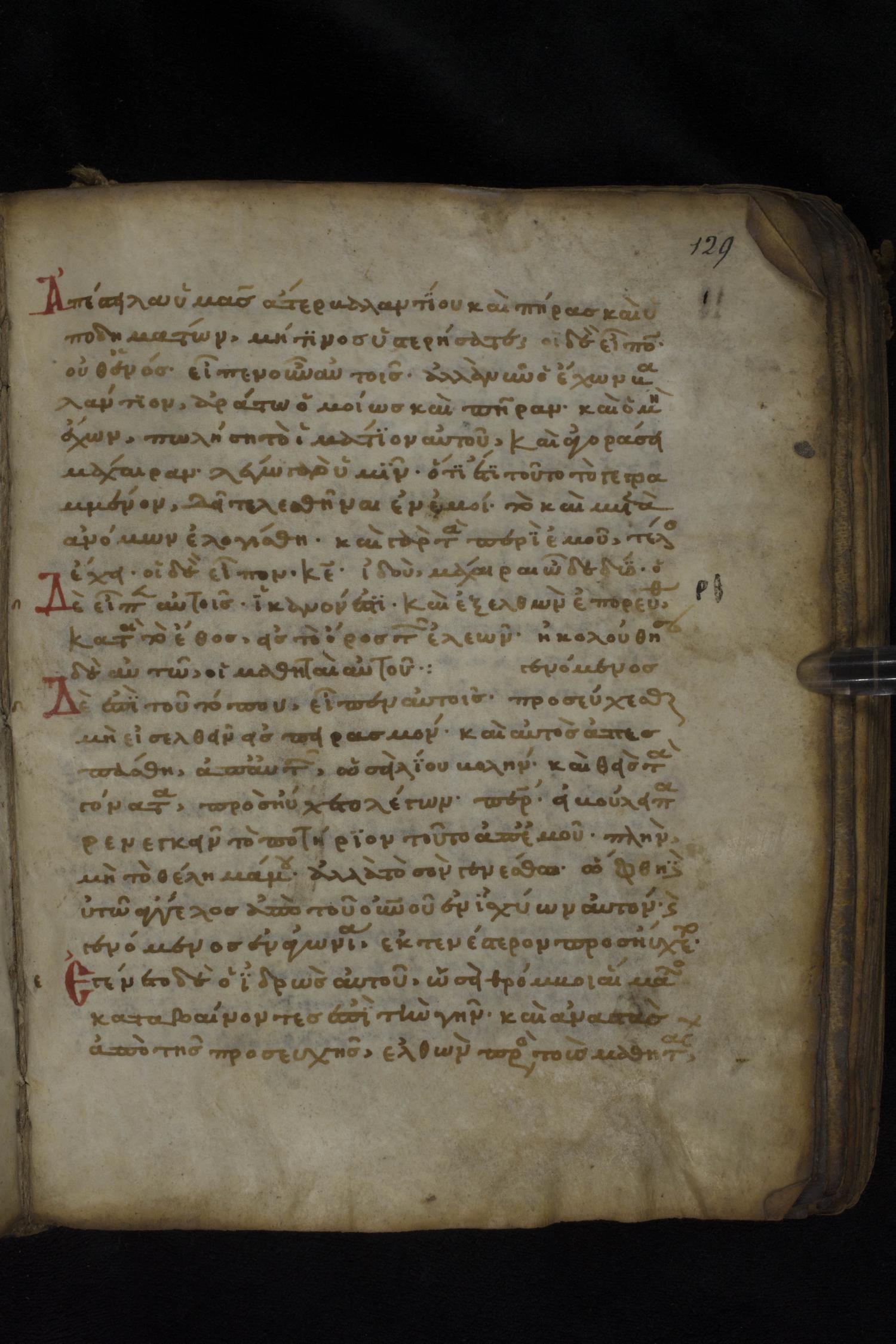 Twelfth century minuscule of the Gospels on parchment; 181 leaves, 1 column, 23-24 lines per column. Images were taken at the National Library of Greece in Athens.