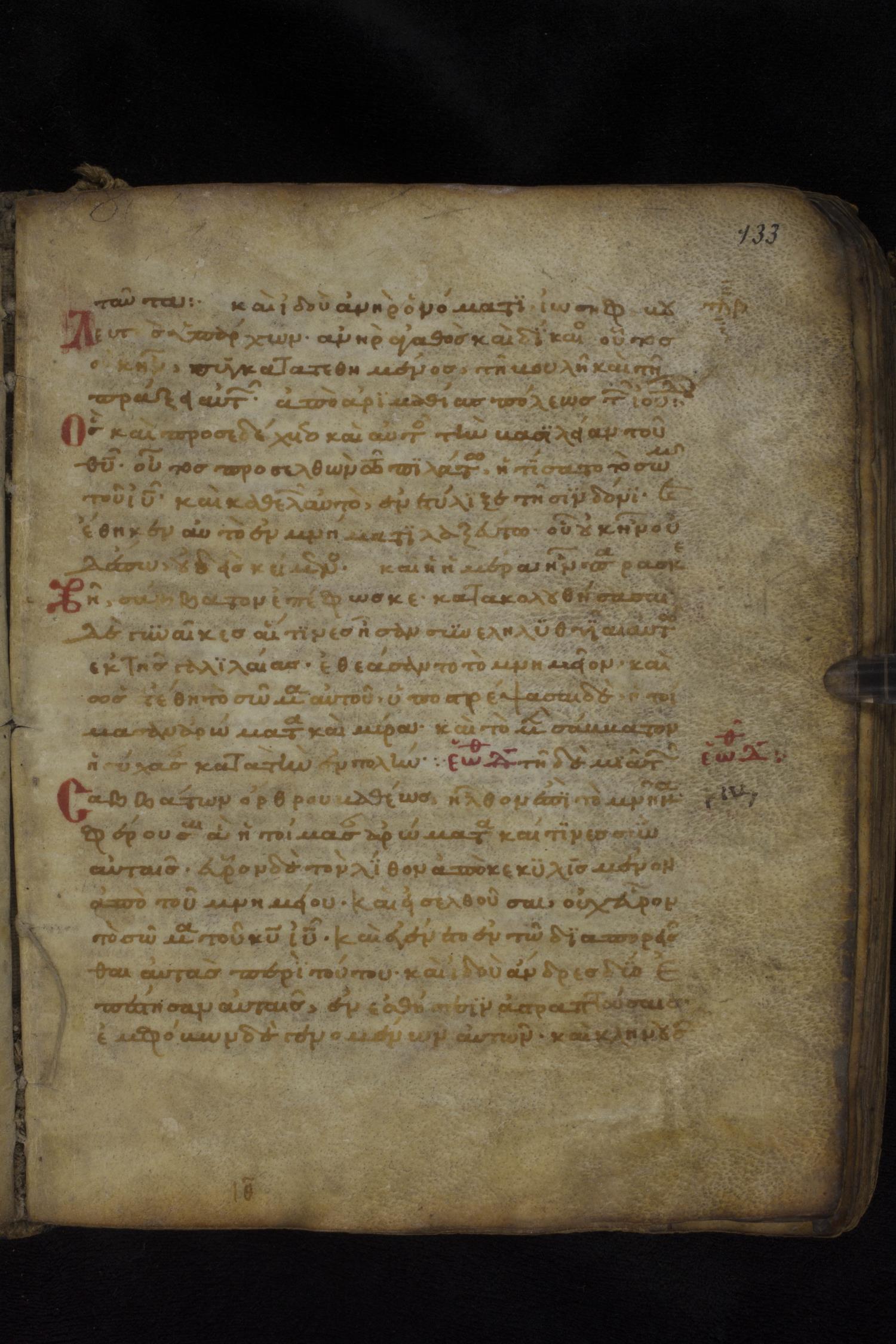 Twelfth century minuscule of the Gospels on parchment; 181 leaves, 1 column, 23-24 lines per column. Images were taken at the National Library of Greece in Athens.