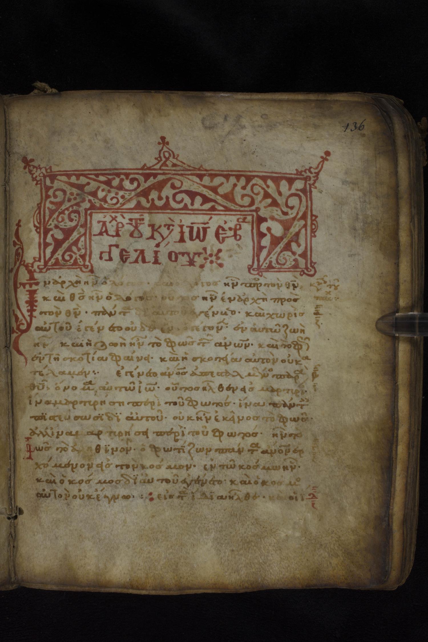 Twelfth century minuscule of the Gospels on parchment; 181 leaves, 1 column, 23-24 lines per column. Images were taken at the National Library of Greece in Athens.