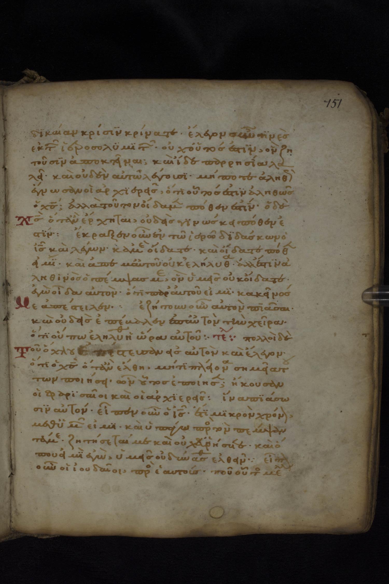 Twelfth century minuscule of the Gospels on parchment; 181 leaves, 1 column, 23-24 lines per column. Images were taken at the National Library of Greece in Athens.